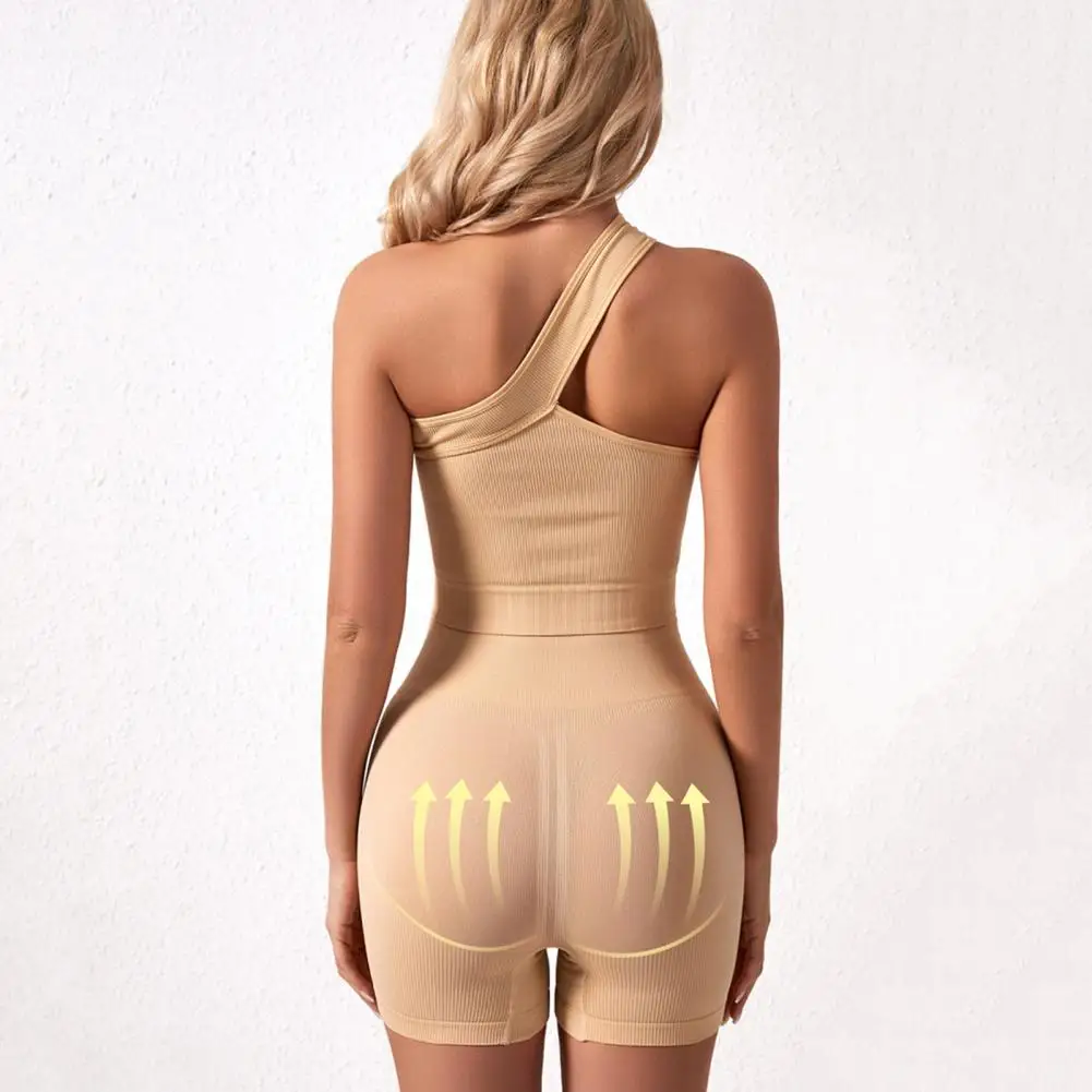 Women Summer Sportswear Off Shoulder Seamless Solid Vest with Sponge Cup High Elasticity Butt-lifted Shorts Set Lady Fitness Set