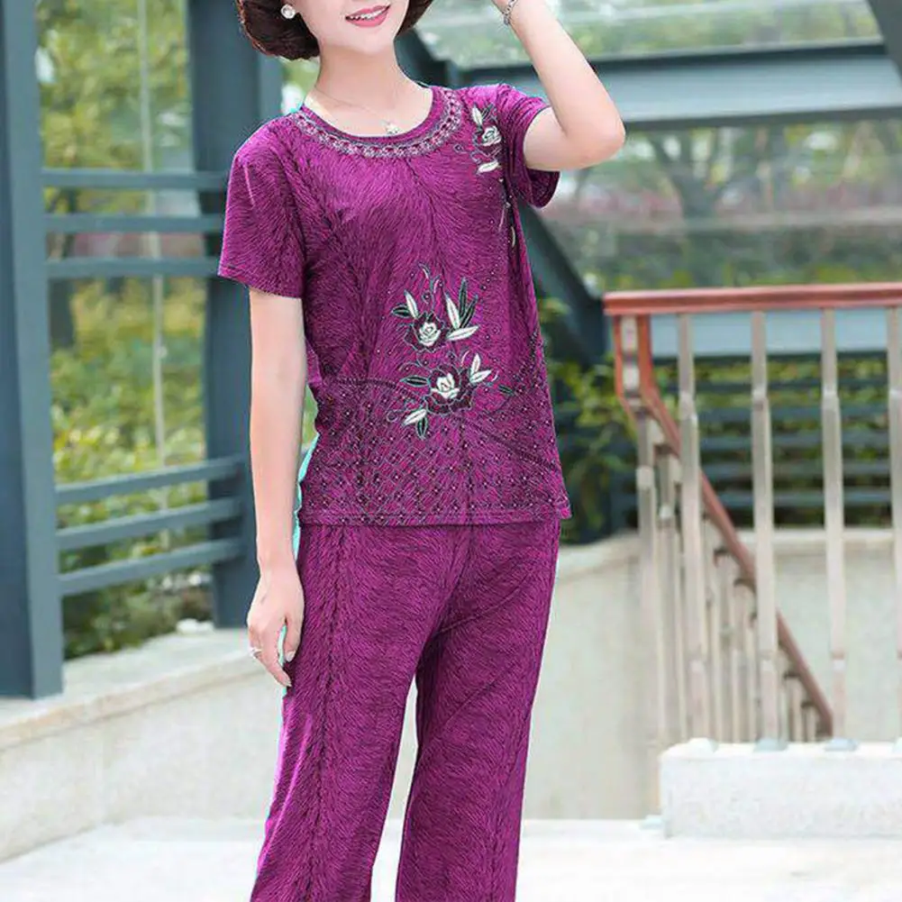 Stylish Floral Print T-shirt Pants Outfit Breathable Homewear Set Floral Print Homewear Outfit for Middle-aged