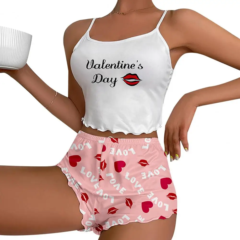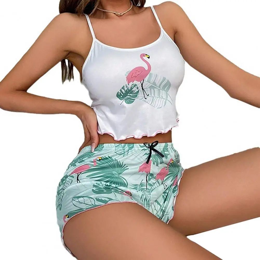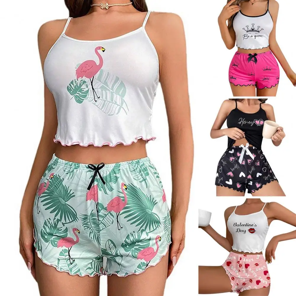 2 Pcs/Set Women Summer Pajamas Set Sleeveless Elastic Short Crop Top High Waist Bow Slim Fit Shorts Homewear Sleepwear Set