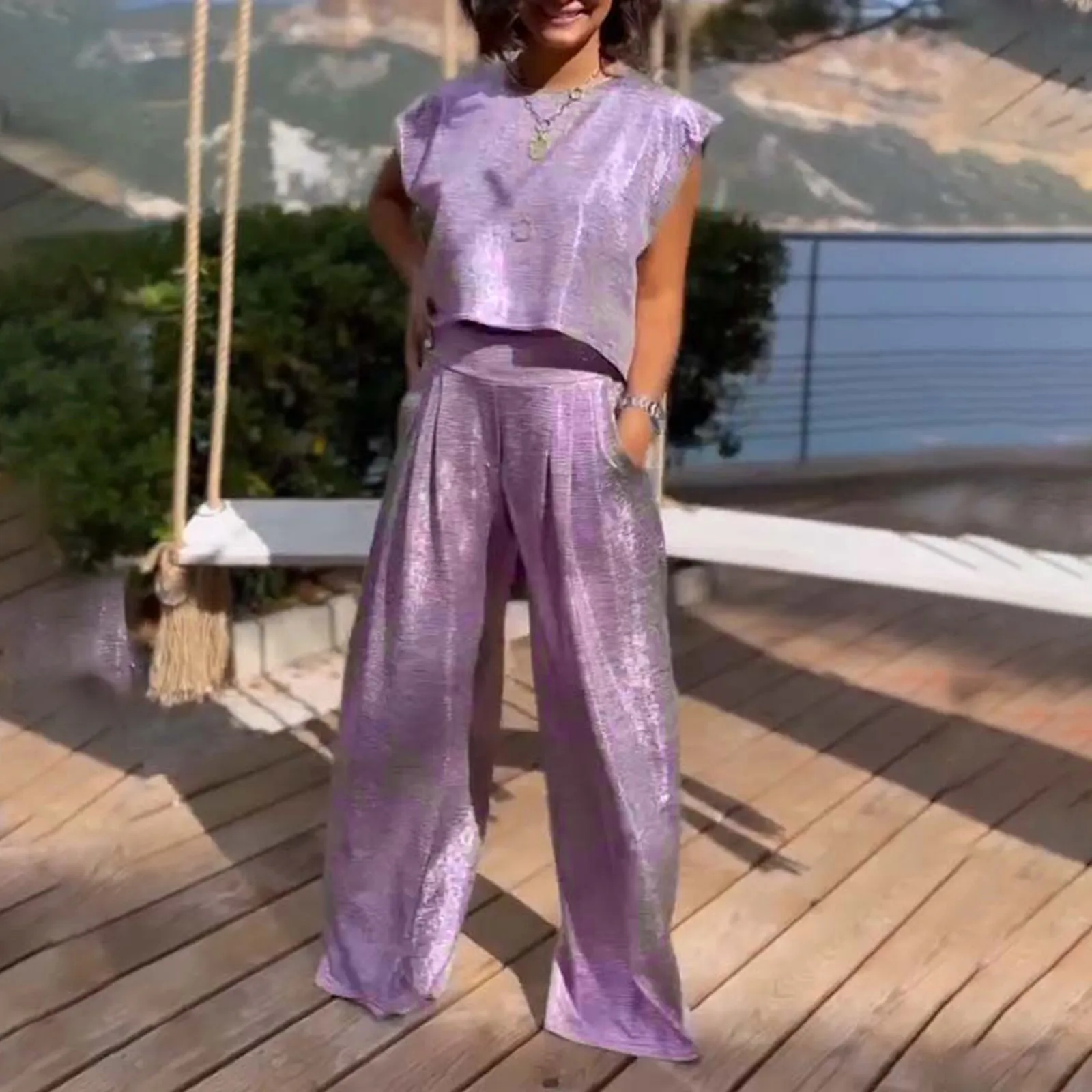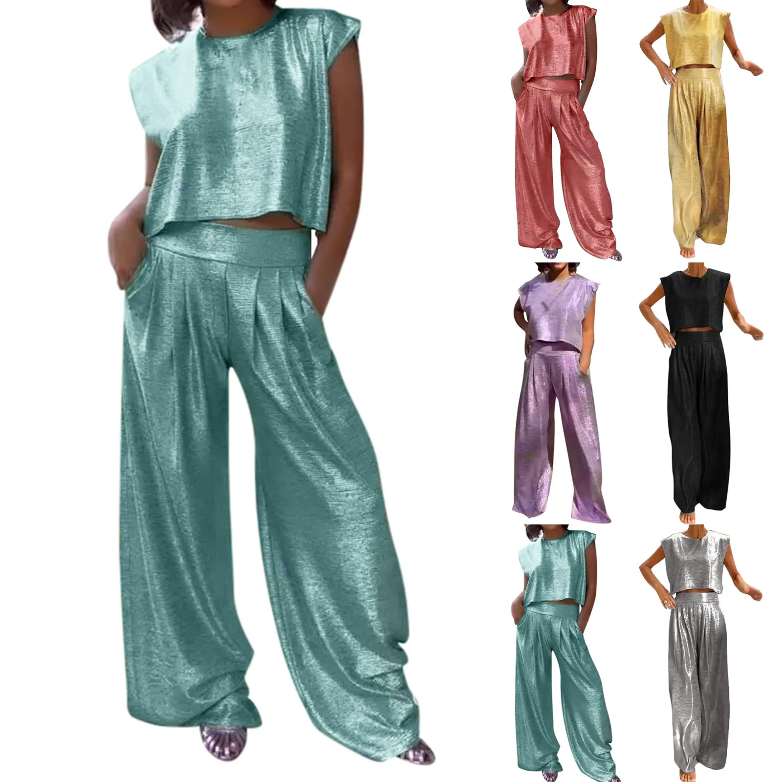 Women's Casual Glossy Vest and Wide Leg Pants 2 Piece Set Loose Sleeveless Round Neck Crop Top Trousers Chic Suit