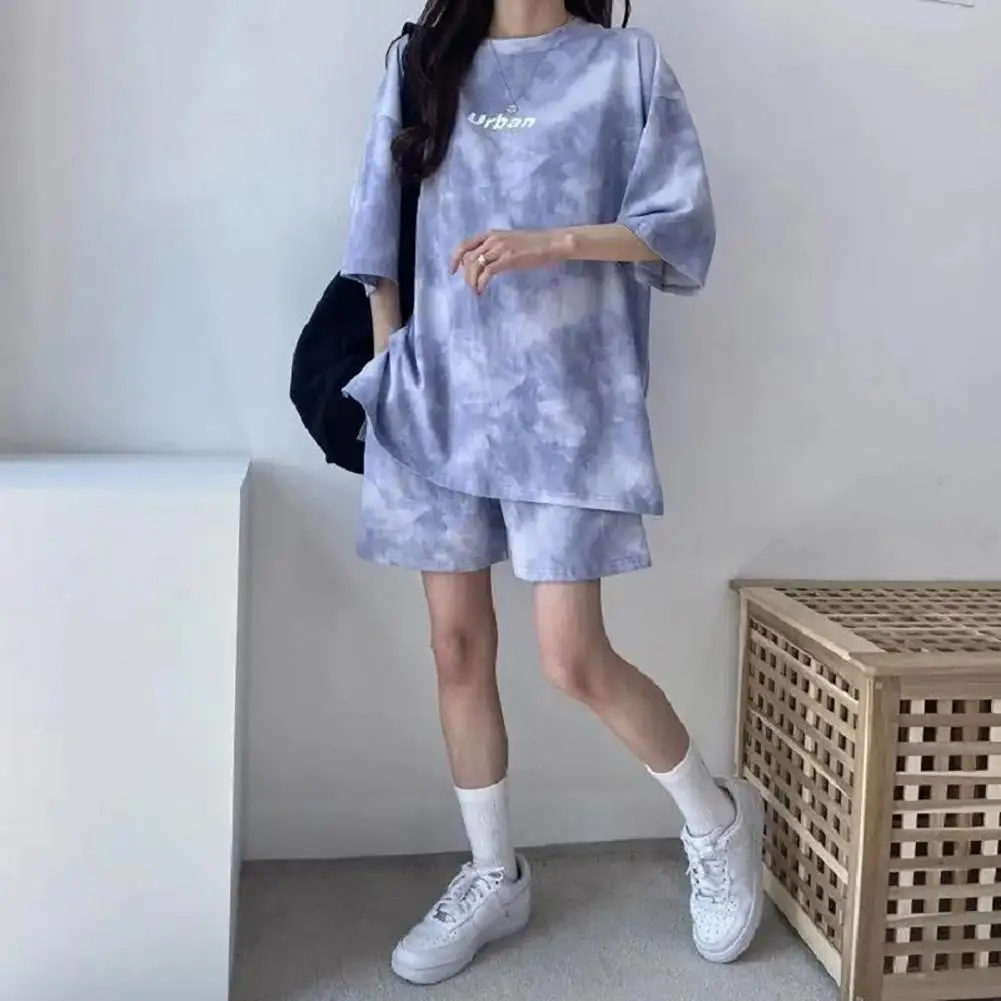 Women T-shirt Shorts Set Tie-dye Summer T-shirt Shorts Set Mid Length Top Elastic Waist Mini Shorts Casual Sport Top Pants Set