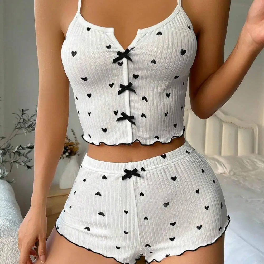 Women Pajama Sets Camisole+Shorts 2 Pieces Suits Summer Female Casual Home Clothes Heart Printed Sleepwear Sexy Bow Nightwear
