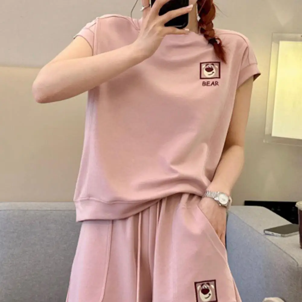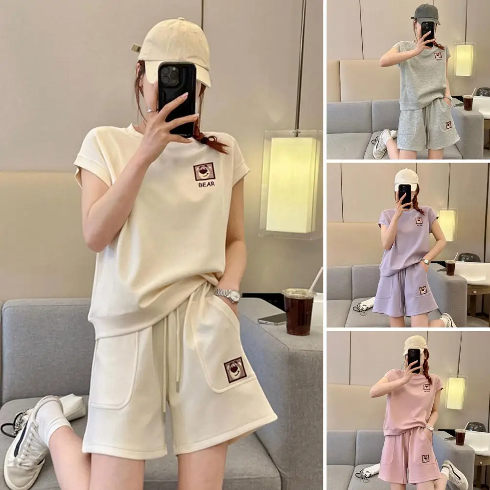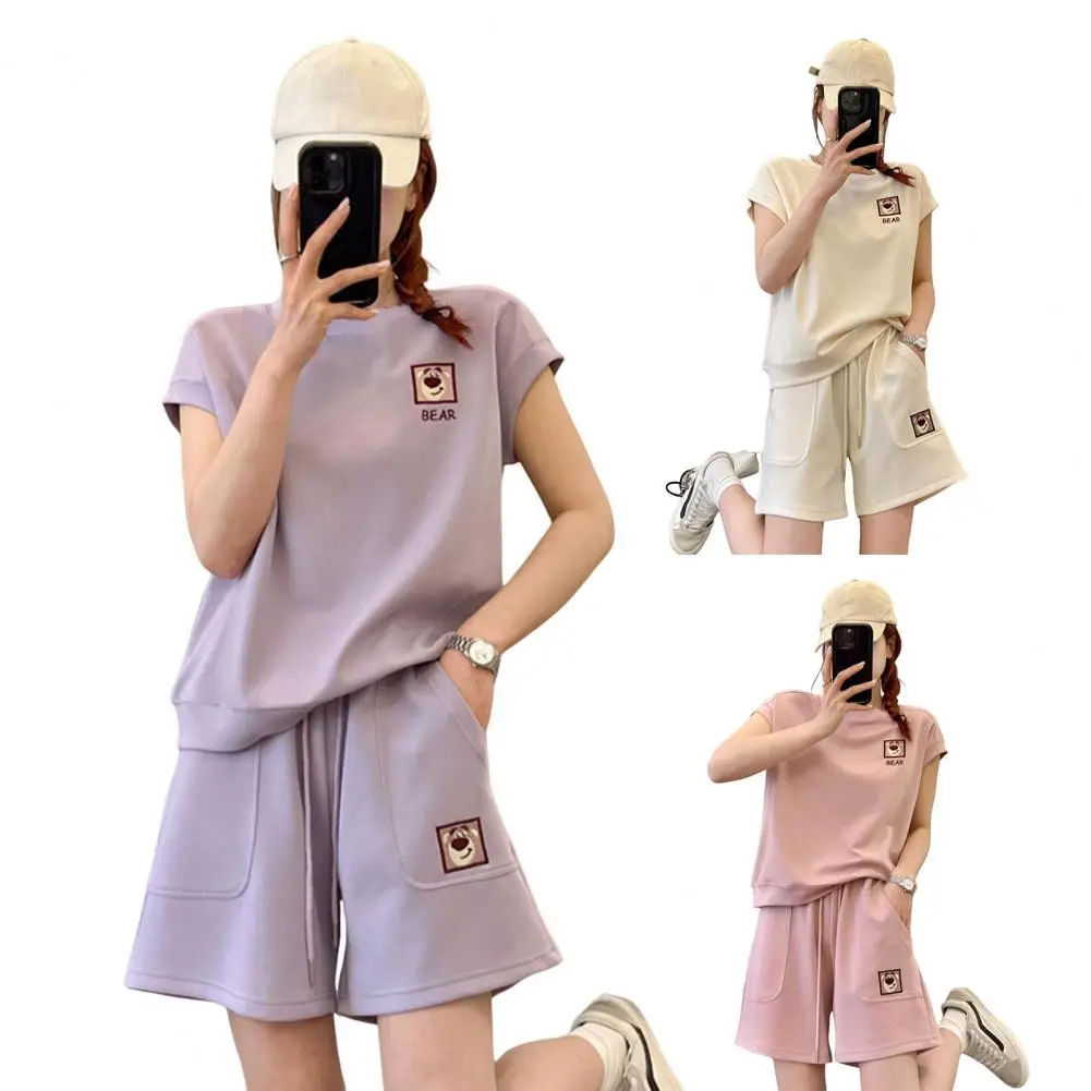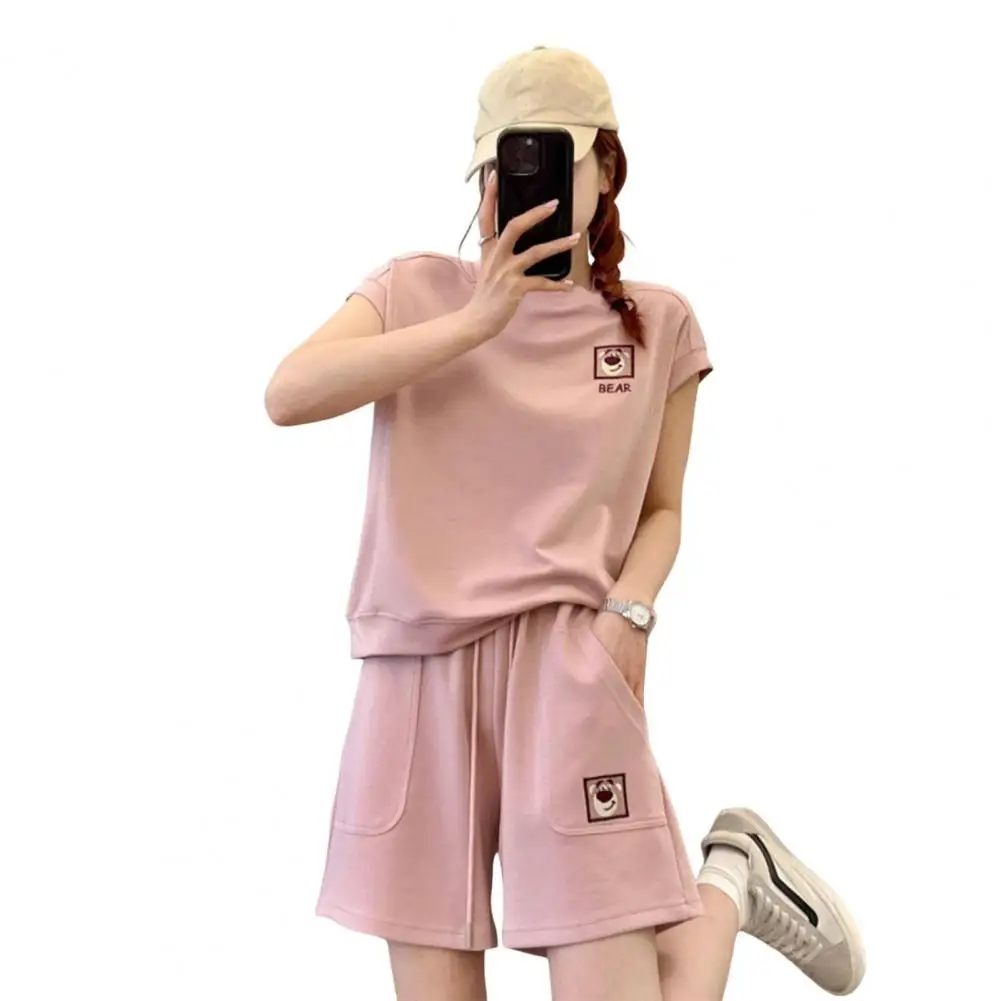 2 Pcs/Set Women Top Shorts Set Short Sleeves T-shirt Drawstring Elastic Waist Loose Above Knee Length Pants Set Casual Tracksuit