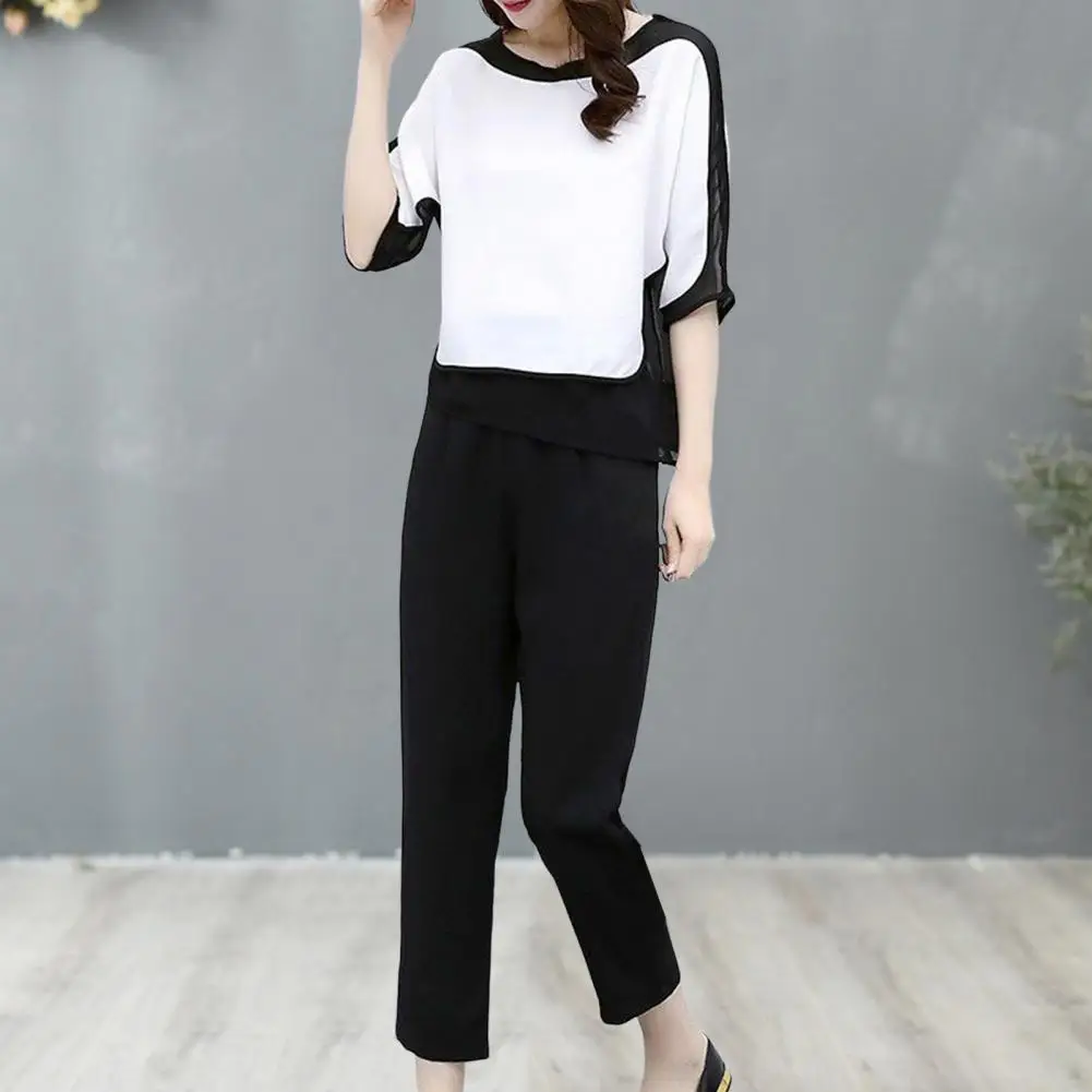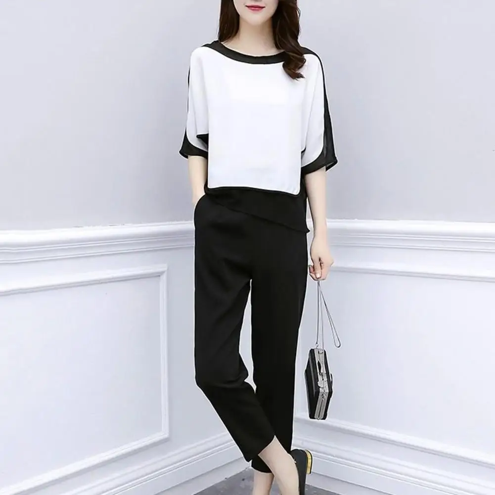 2Pcs/Set O-Neck Batwing Half Sleeve Casual Outfit Mid-rise Pockets Top Pants Set Patchwork Color Tee Top Straight Leg Pants