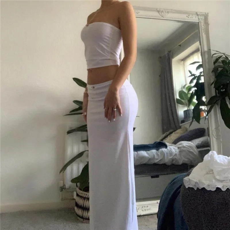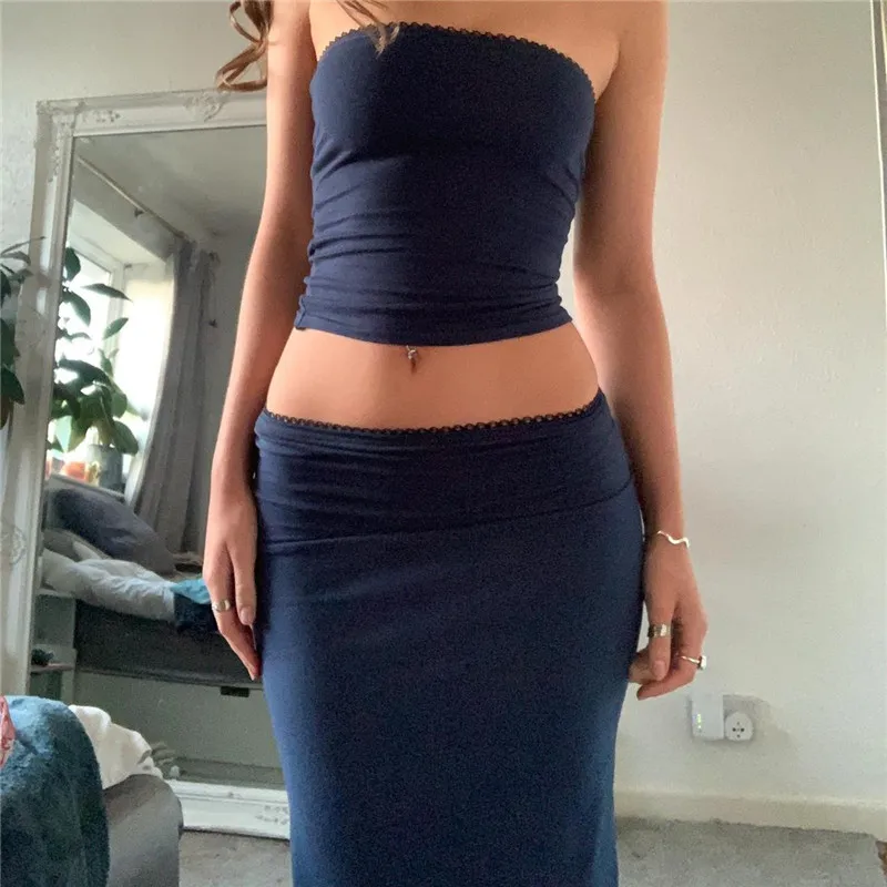 Women 2 Piece Skirt Sets Summer Elegant Chic Flower Decor Strapless Tube Tops +Slim Midi Skirts Outfits for Party Streetwear Y2K
