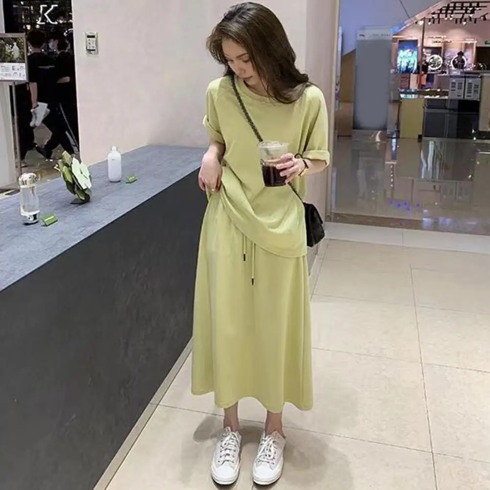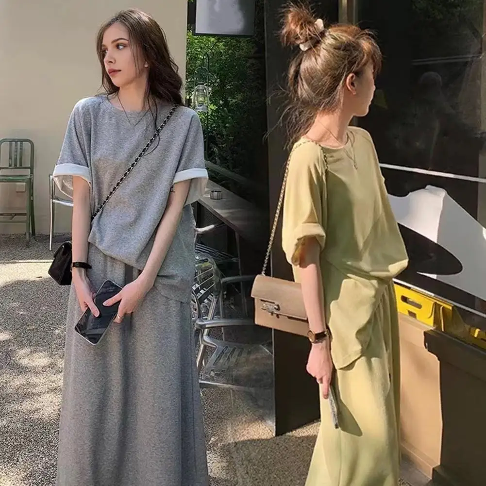 Women Top Skirt Set Maxi Skirt Top Set Chic Women's 2-piece Set Short Sleeve T-shirt Pleated Maxi Skirt Adjustable for Commute