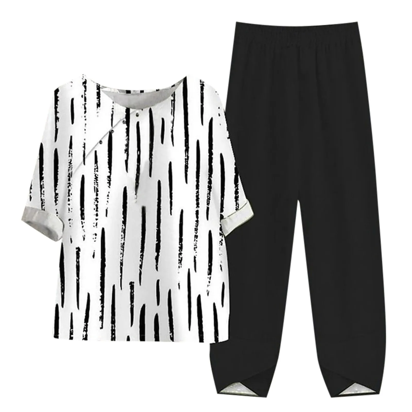 Name | Women Casual 2 Piece Set Round Neck Five Quarter Sleeve Simple Floral Stripe Print Top High Waist Pants Ladies Loose Outfits |