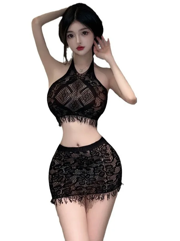 Name | Mesh Lace Skirts Set Tassels Underwear Sexy Halter Neck Tassel Fishing Net Split Mesh Uniform Transparent Sexy Women HIN8 |