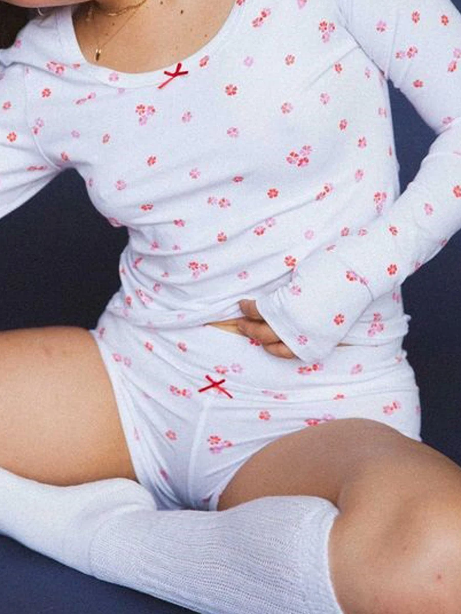 Women's Two Piece Lounge Set Crew Neck Long Sleeve Floral Print Crop Tops Solid Color Elastic Waist Shorts Sleepwear Home Wear