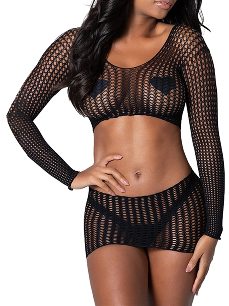 Long Sleeves Solid Sexy Slim Crop T-Shirt Skirt 2 Piece Sets 2024 Summer Women Y2K Streetwear Sports Fishnet Lingerie Set