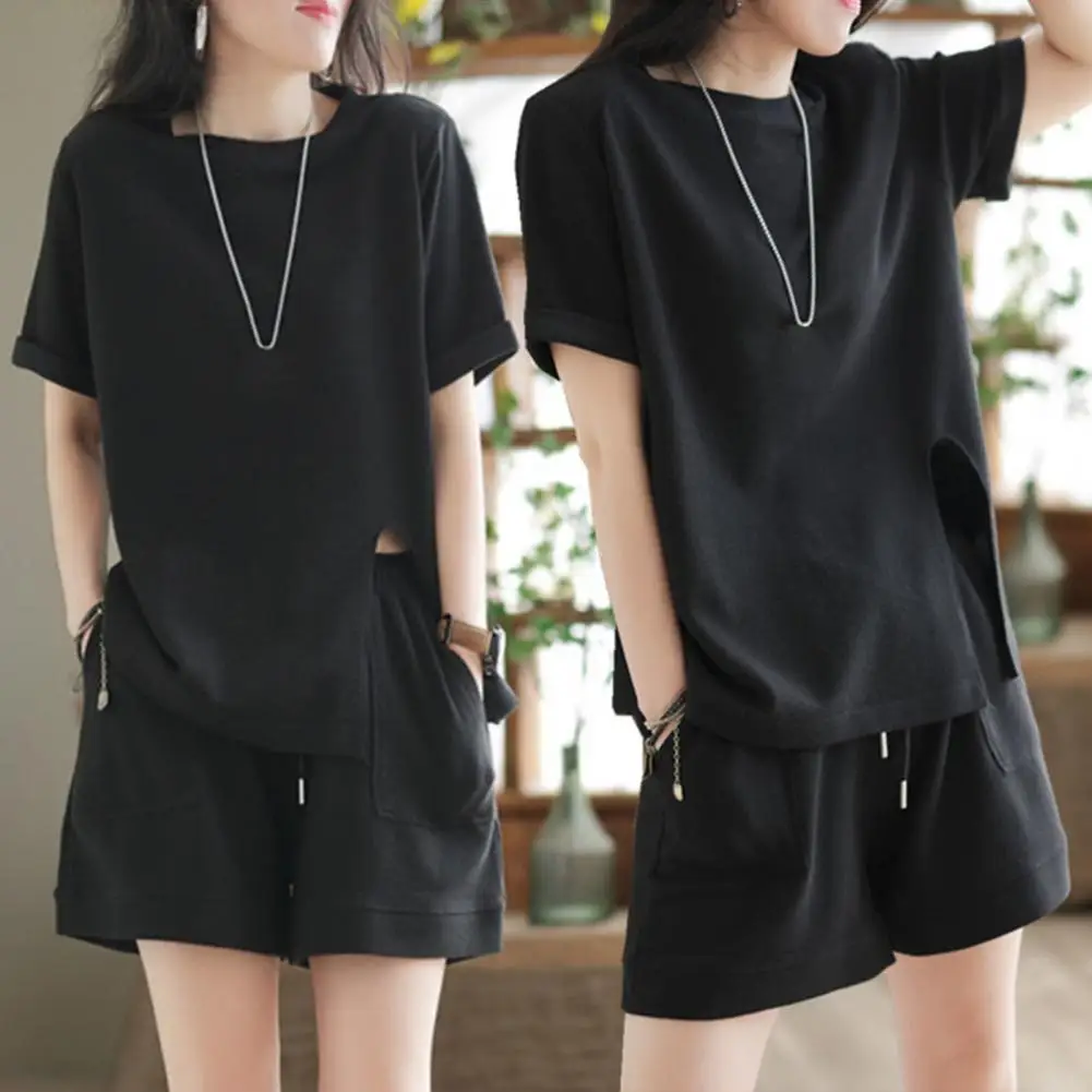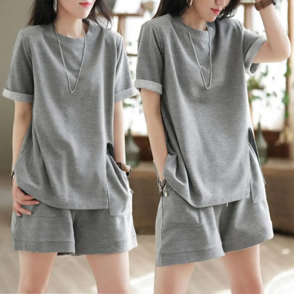 Casual Shorts Set Solid Color Simple Style with Pocket Extra Soft Polyester Women Summer Shirt Shorts Suit Streetwear for Girl