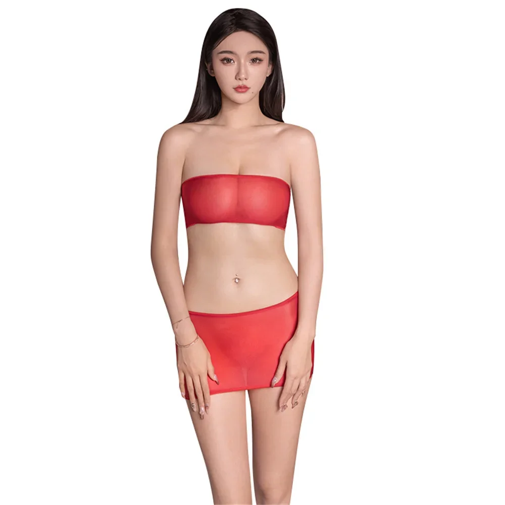 Name | Sexy Two Piece Outfits for Party Women Thin Sheer See Through Tight Top and Skirts Oil Glossy Elastic Packet Hip UltraShort Sets |