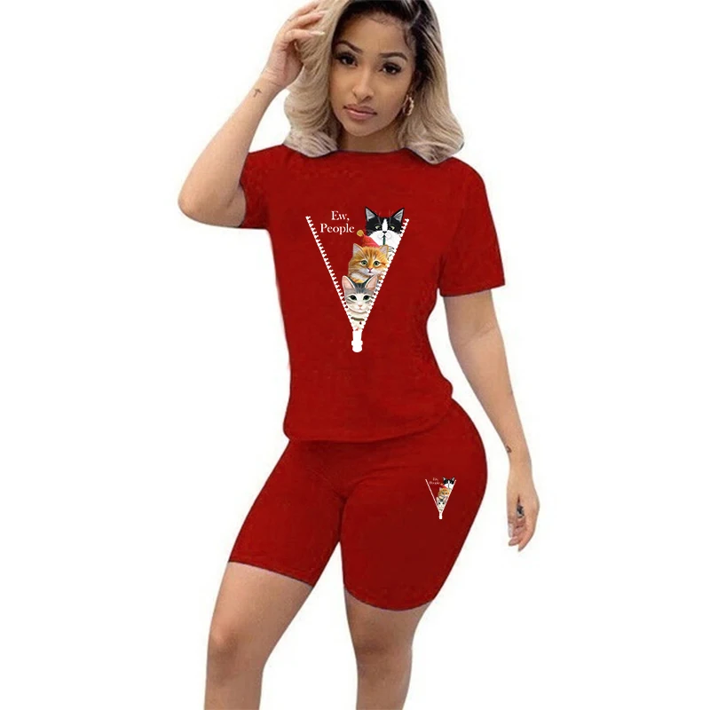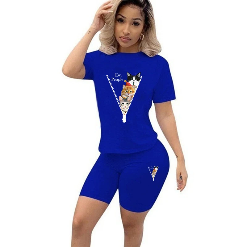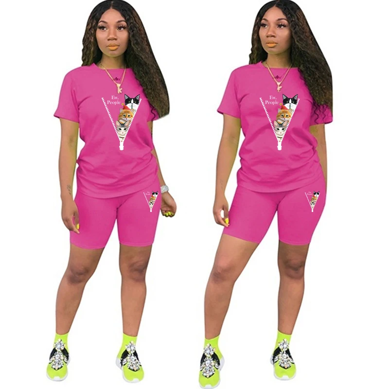 Summer Women's Fashion Positioning Printing Suit Casual Two-piece Short-sleeved O-Neck Top Shorts Two-piece Suit