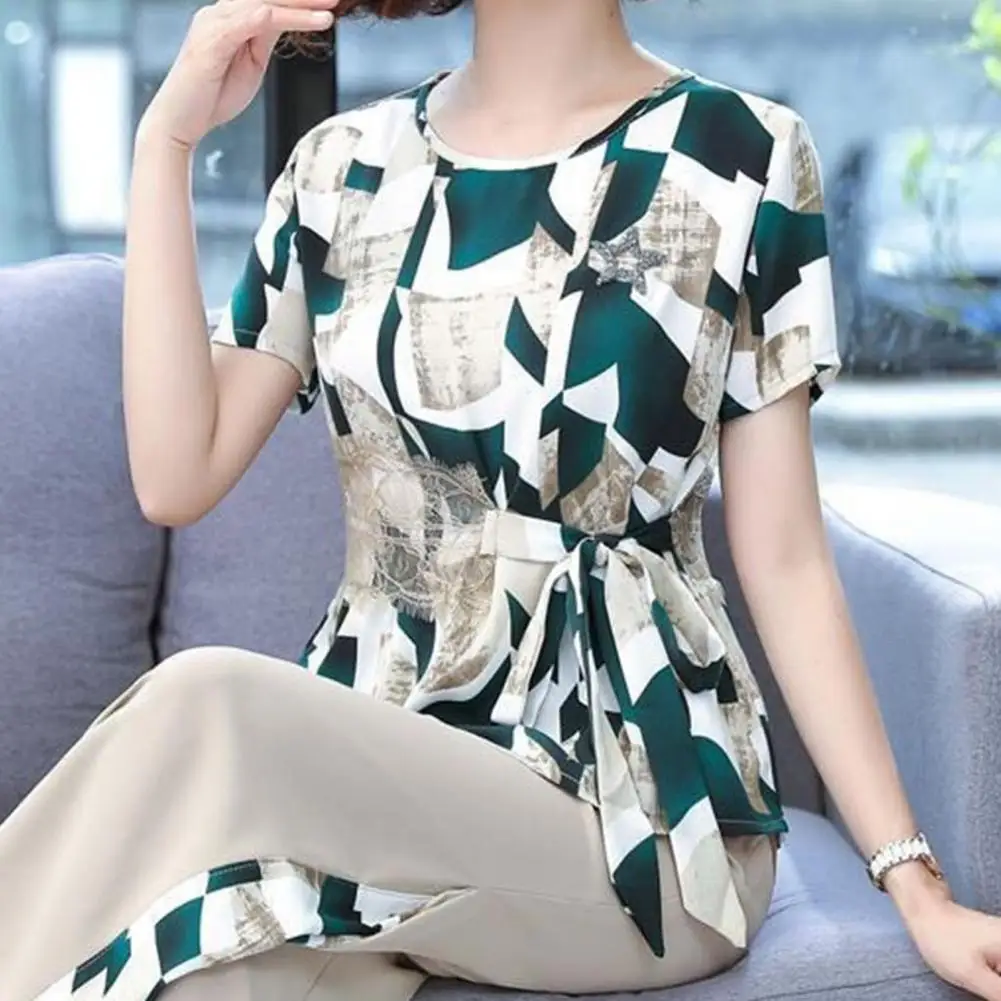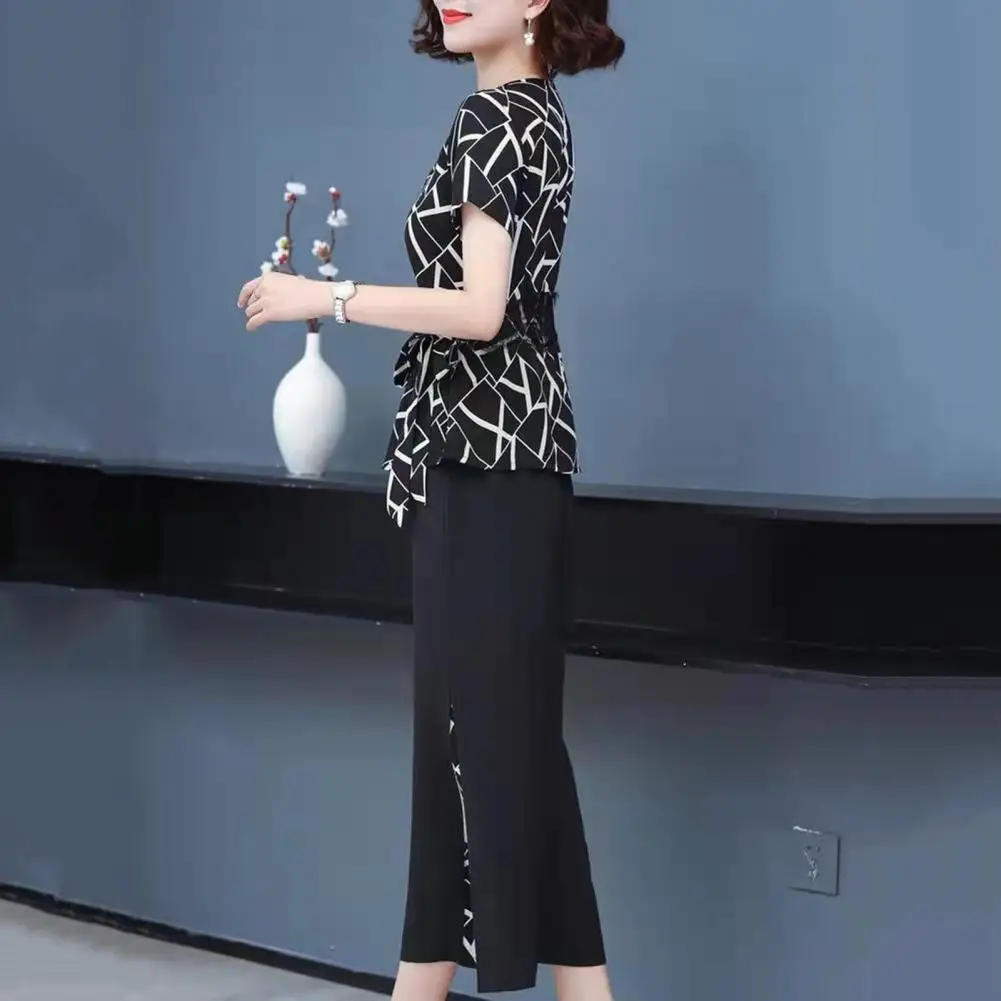 Women Outfit Casual Suit Floral Print Women's Top Pants Set with Lace-up Detail O Neck T-shirt Wide Leg for Mid-aged