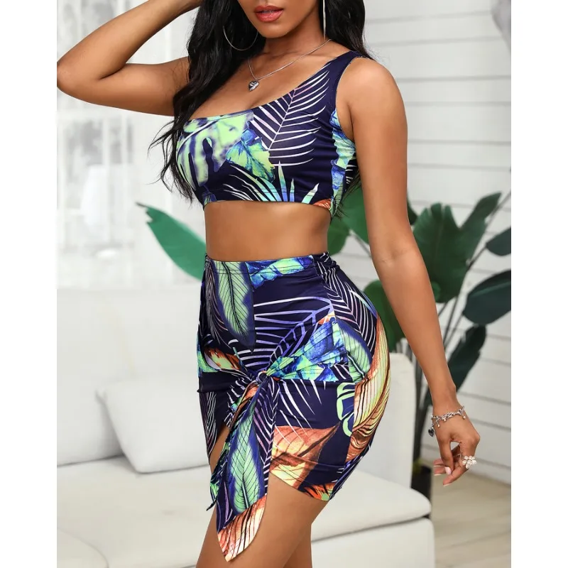 Women Sexy Off Shoulder Slash Neck Short Vest High Waist Lace Up Mini Irregular Skirt Suit Spring Summer New Slim Printing Suit