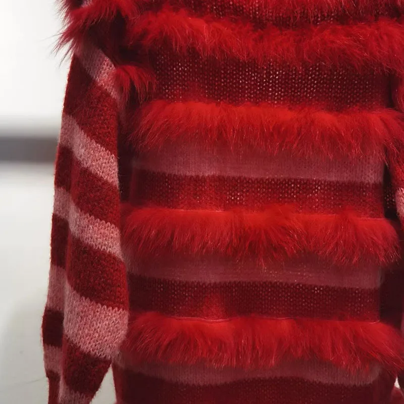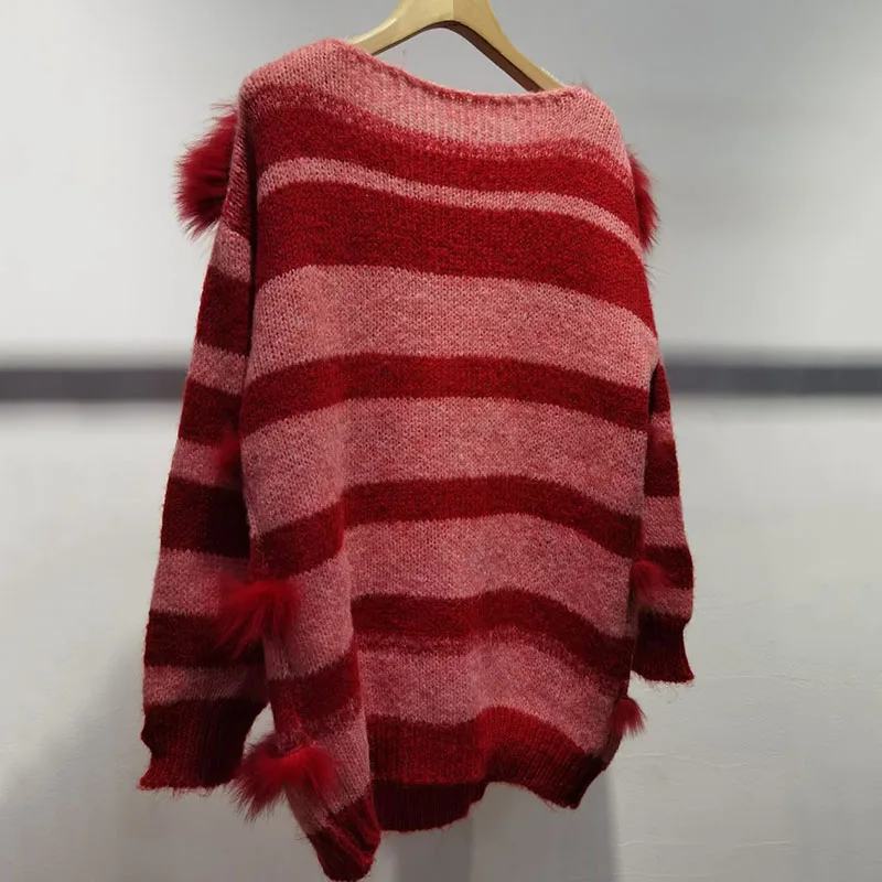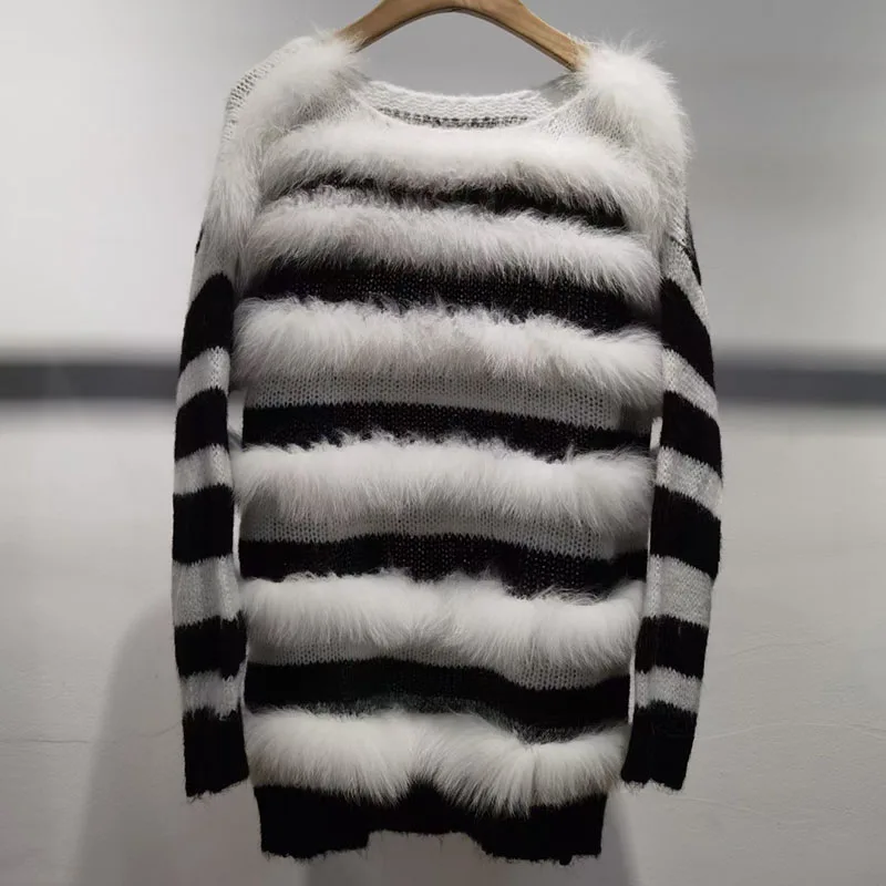 Women Long Knitted Pullover Sweater With Real Fox Fur Stripe Loose O-neck Long Sleeve Autumn Warm Knitted Pull Jumpers Female