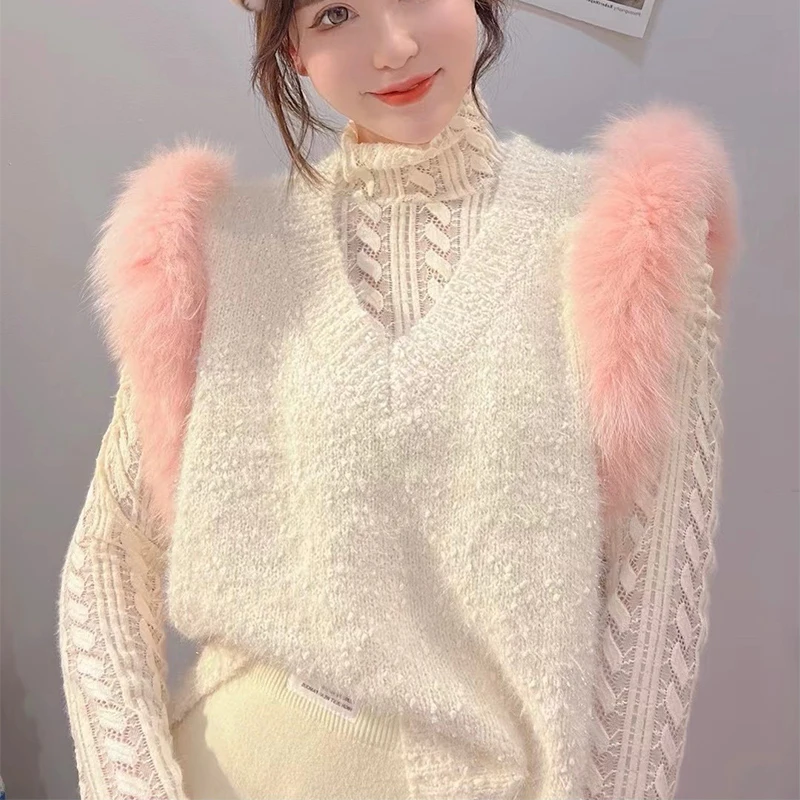 Spring Korea Style Women Fashion Fox Fur Decoration Sleeveless Autumn Vest Sweater Spring Knitted Waistcoat Vest