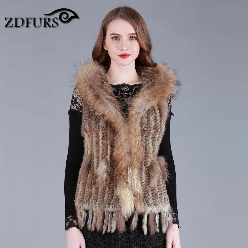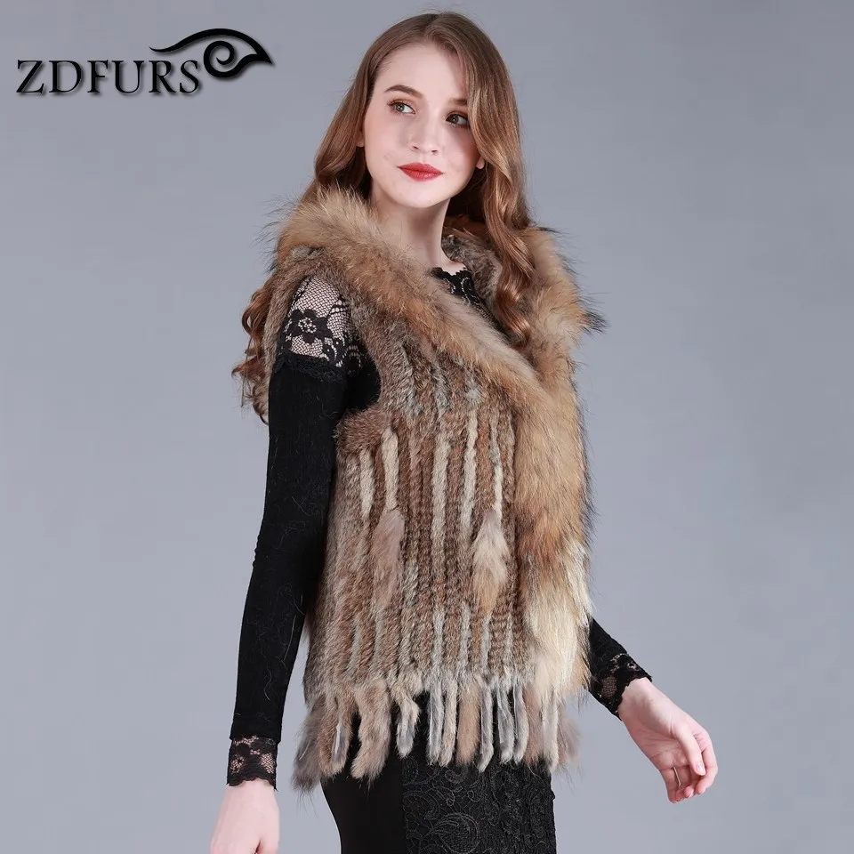 ZDFURS * fashion rabbit fur vest raccoon fur trimming knitted rabbit fur vest with hood fur waistcoat gilet ZDKR-165037