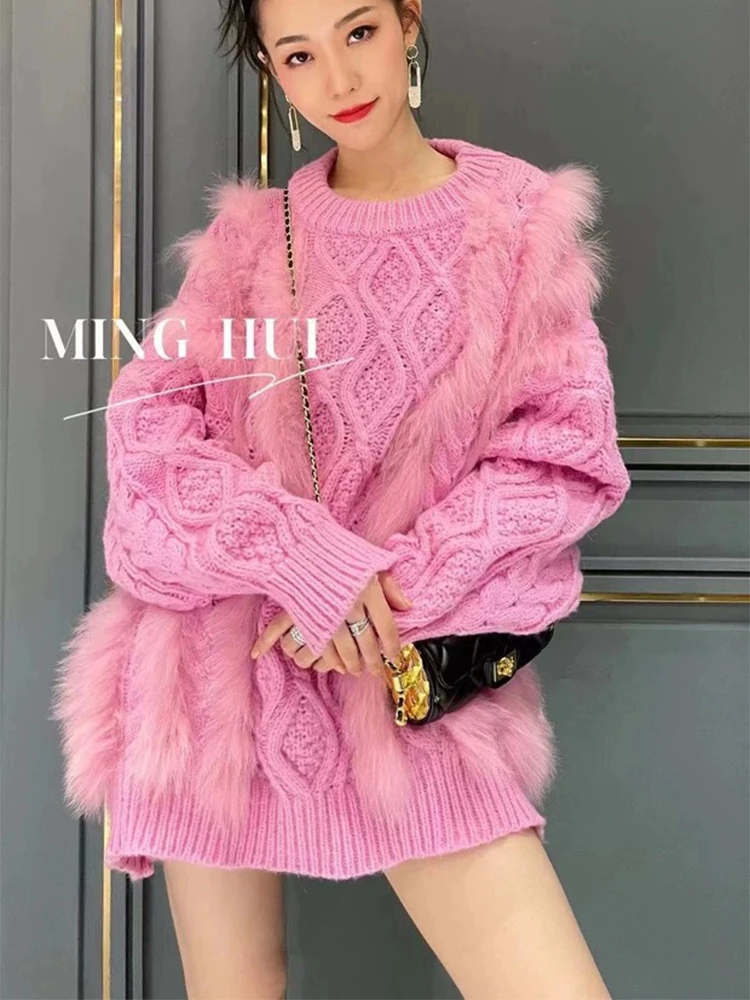 Women Fashion Real Fox Fur Strip Knitted Cardigans Sweater Real Fur Loose Oversize Autumn Spring Long Knitwear