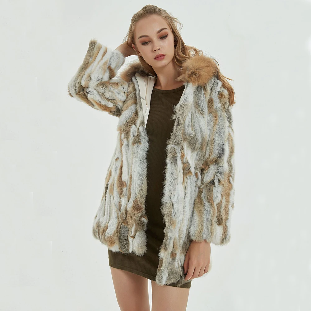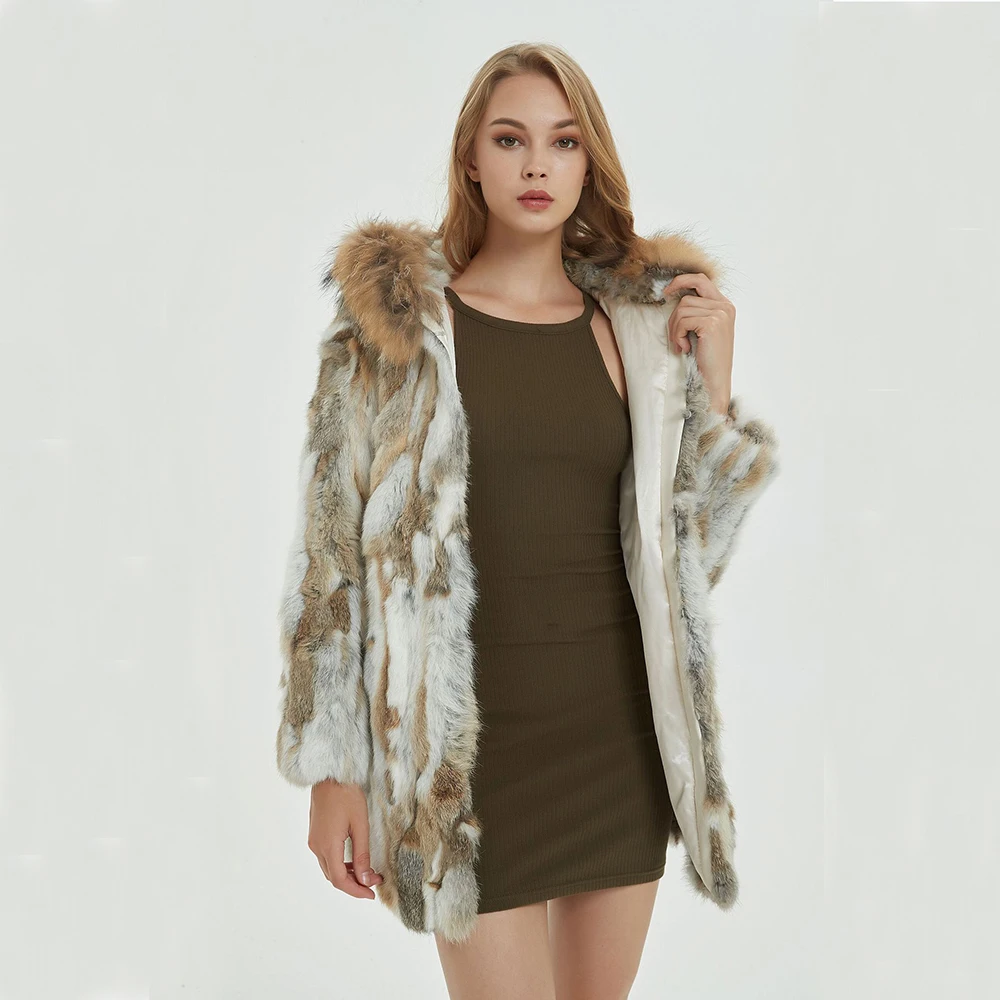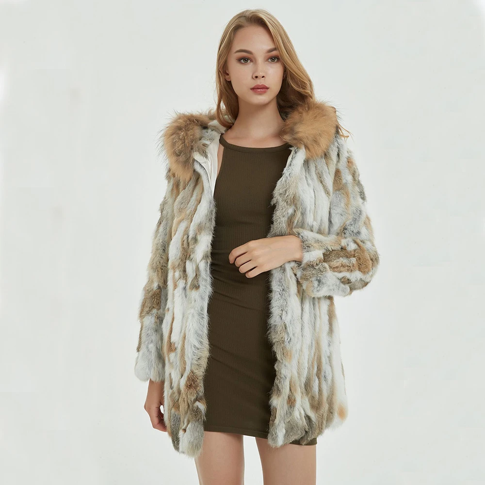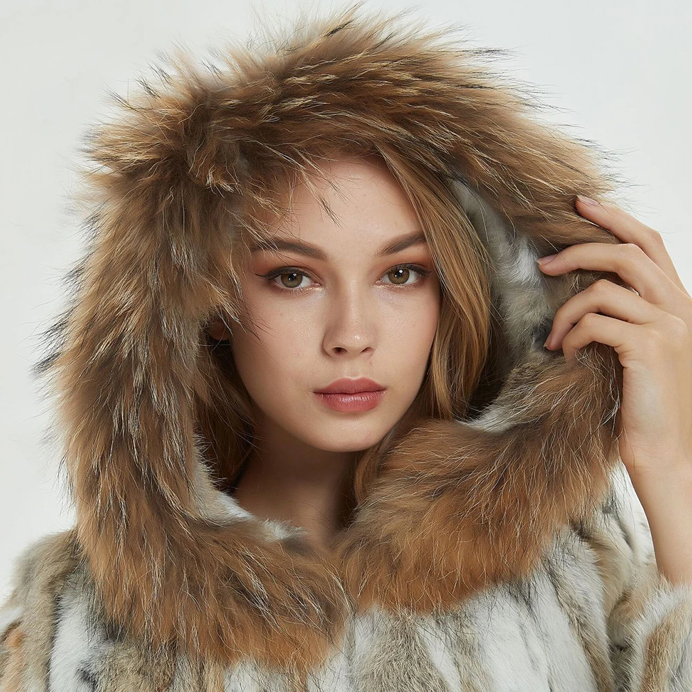 New Women's Real Genuine Natural Rabbit Fur Coat With Raccoon Fur Hood Lady Fashion Jacket Outwear Custom Any Size