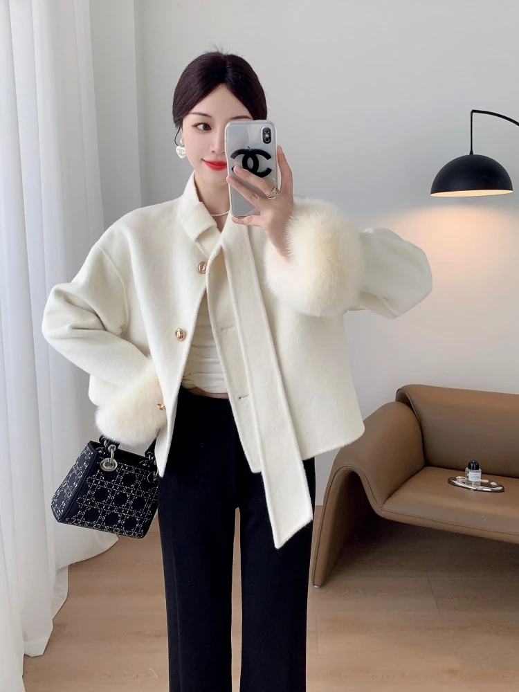 23 Winter New Bow Short Cuff Fox Fur Fur Double-Faced Woolen Goods Cashmere Wool Overcoat Coat for Women