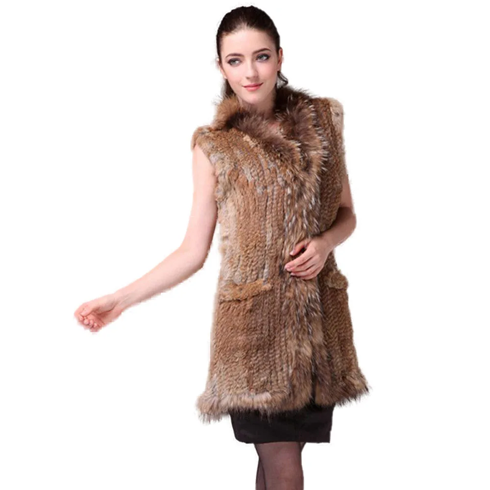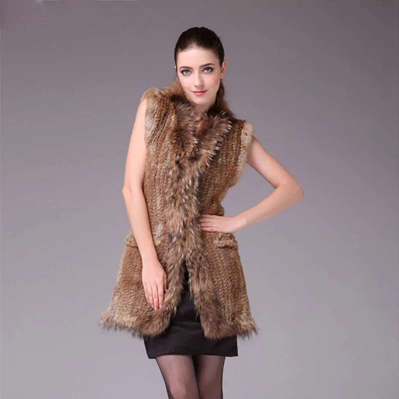 New Knitted Rabbit fur vest with raccoon fur collar gilet sleeveless garment waistcoat natural brown /white