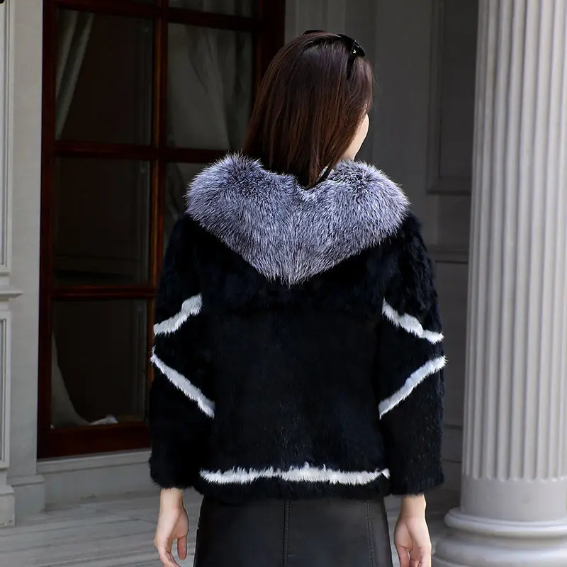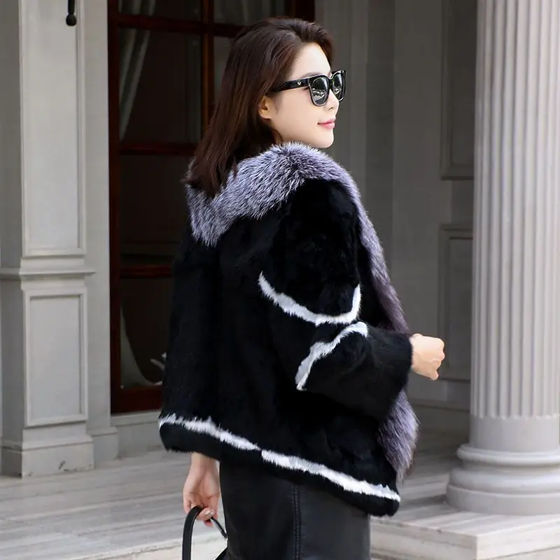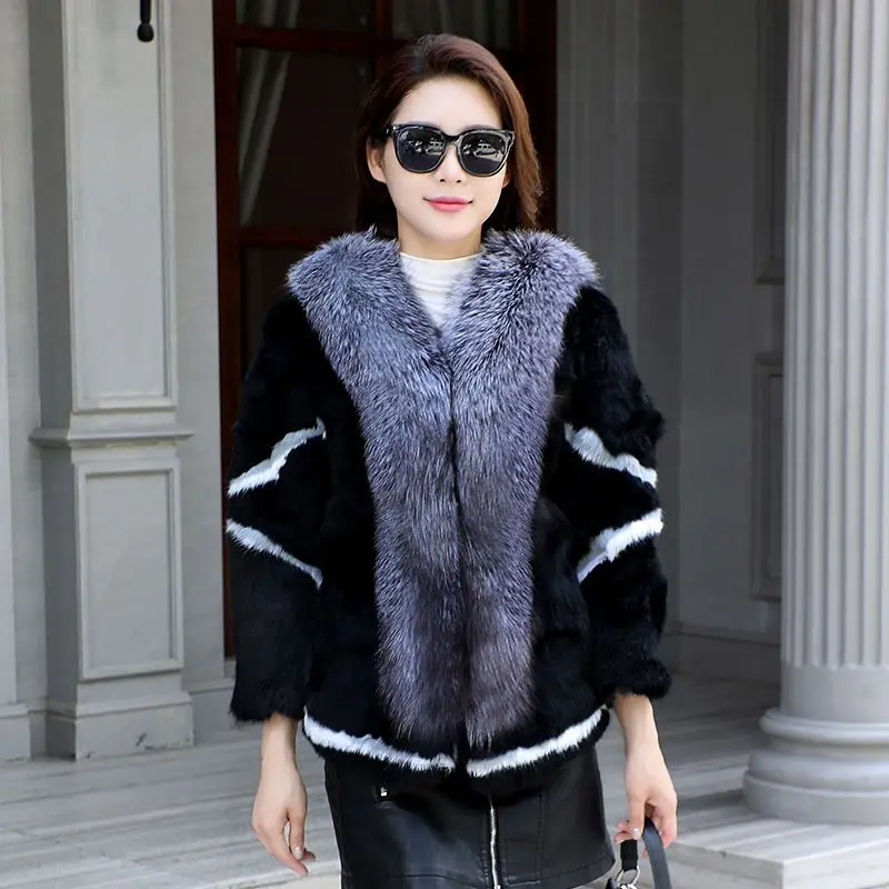 Women Winter 100% Real Rabbit Fur Coat With Silver Fox Fur Collar Natural Warm Rabbit Fur Jacket Female Quality Real Fur Coats