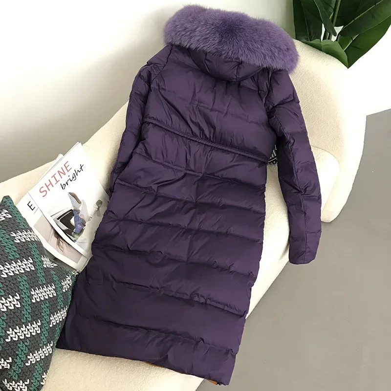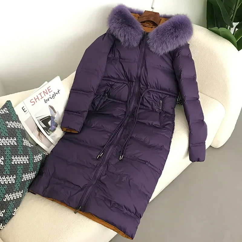 2023 New X-Long Jacket Real Raccoon Fox Fur Collar Hooded Winter Women White Duck Down Female Thick Warm Coat Luxury Outerwear