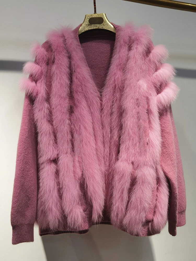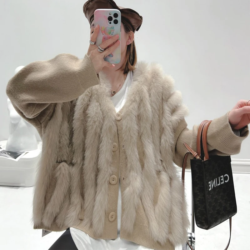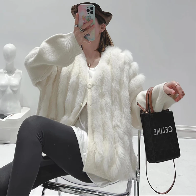 Spring Women Real Fox Fur Knitting OverSize Loose Fox Fur Decoration Lady's Fashion Autumn Luxury Sweater Coat