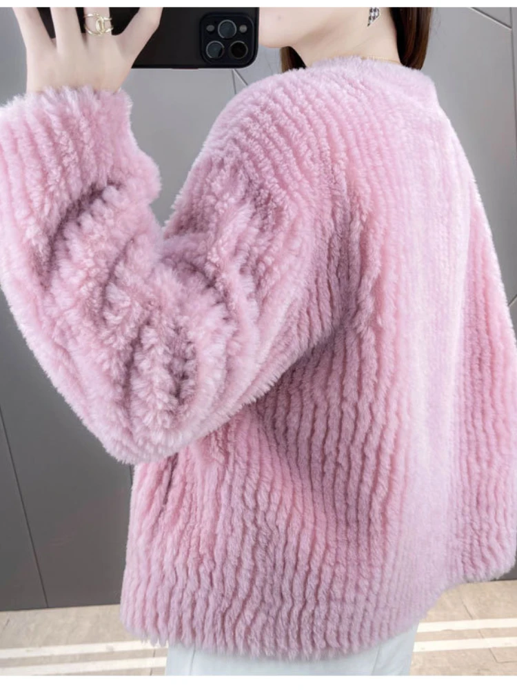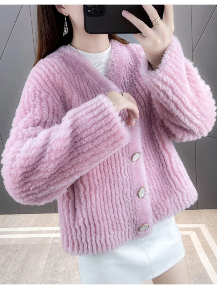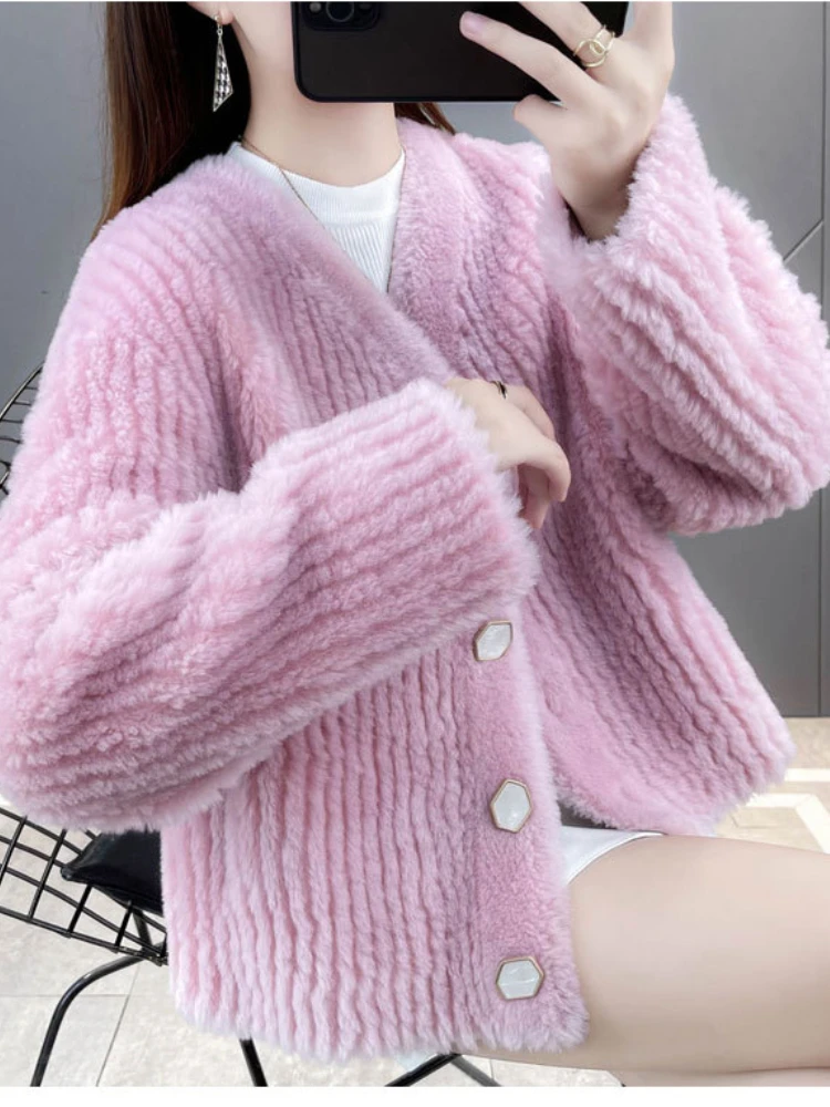 Casual Button Winter Jacket Women Real Fur Coat Natural Knitted Wool Fur Thick Warm Loose Streetwear Fashion Outerwear