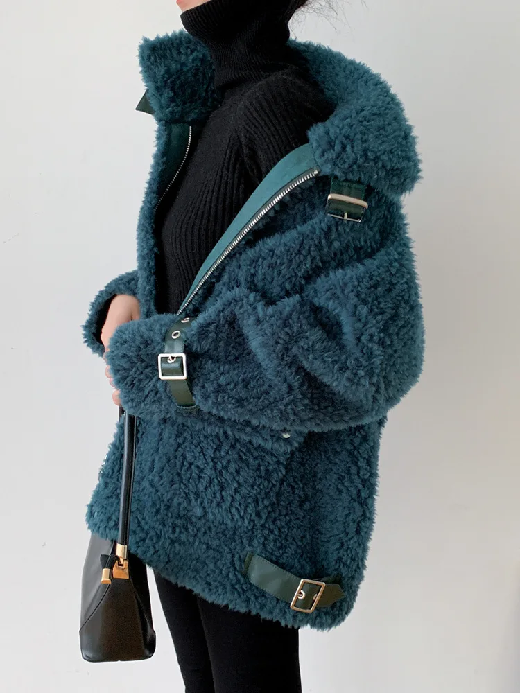 MENINA BONITA 2022 Fashion Winter Jacket Women Coat Weave Real Natural Wool Fur O-Neck Zipper Loose Warm Streetwear Overcoat