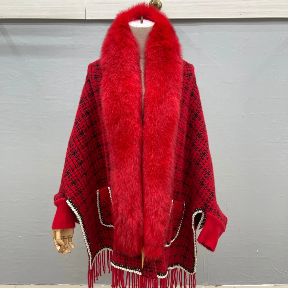 MENINA BONITA Real Fox Fur Collar Coat Winter Jacket Women Knitted Poncho Long Sleeve Tassel Scarf Vintage Cardigan Oversize