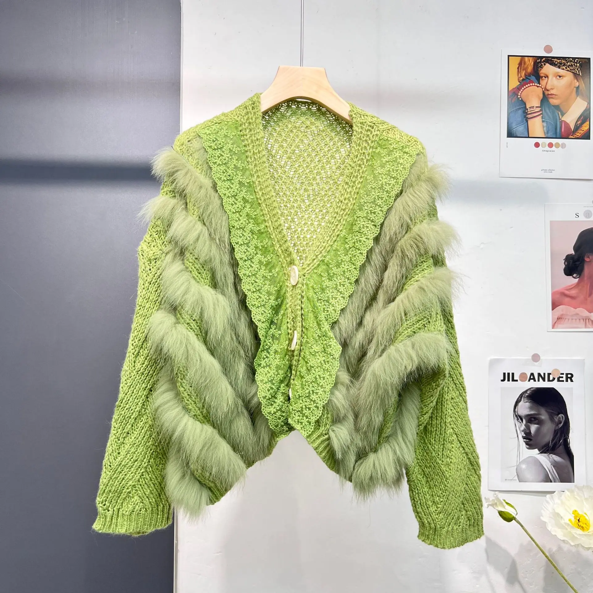 Autumn and Winter New Haining Fur Coat Knitted Cardigan Fox Hair Car Stripes Lace Young Style Celebrity 2023