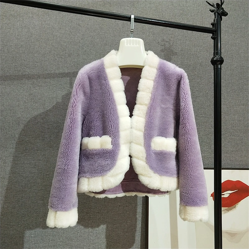 JT3140 Women Girl Lamb Fur Warm Short Jackets Lady Sheep Real Wool Fur Winter V-Neck Overcoat Parka