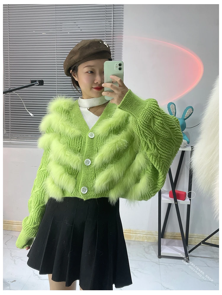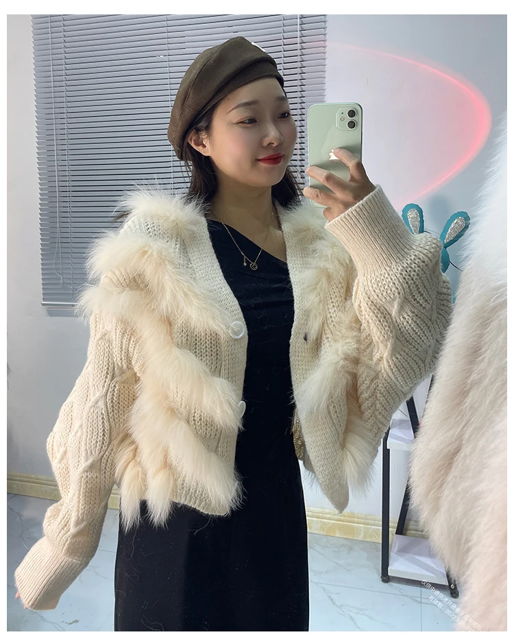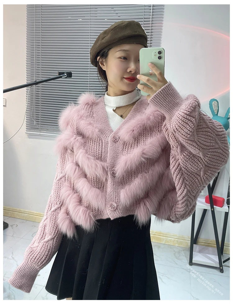 2023 New Women Spring Purple Sweater Thin Real Fox Fur Outside Decoration Oversize Loose Lady's Fashion Thin Sweater Coat