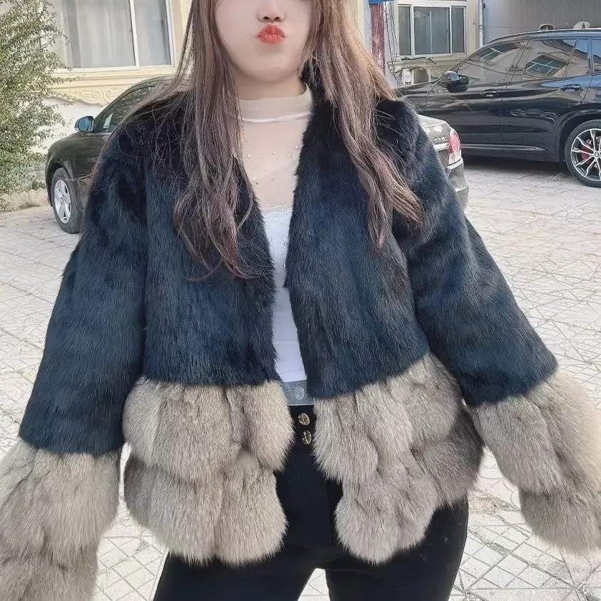 Autumn Winter Fashion Women's Natural Rabbit Fur Short Coat Jacket Whole Skin Fox Patchwork Cuffs And Lap Thick Warm Clothes