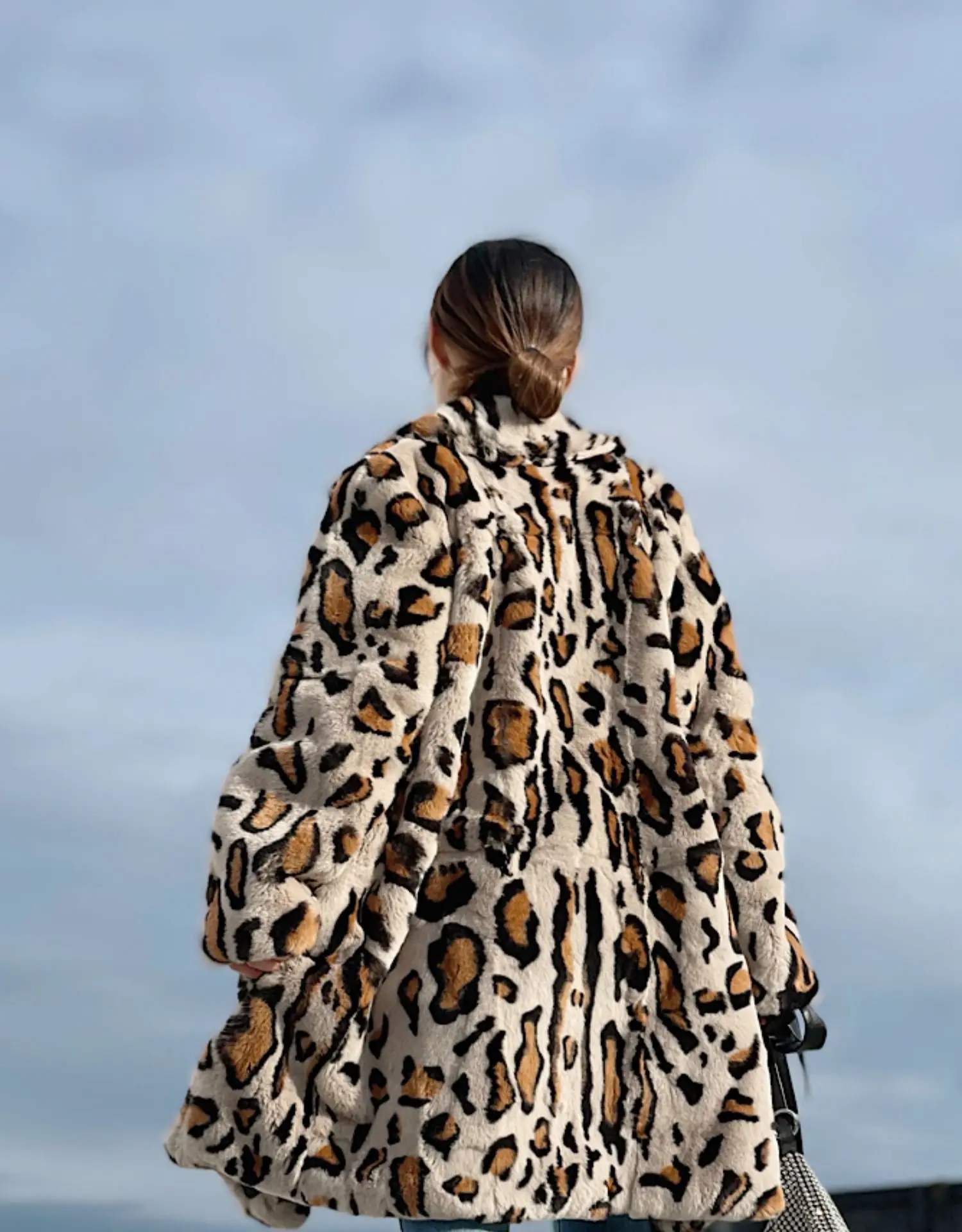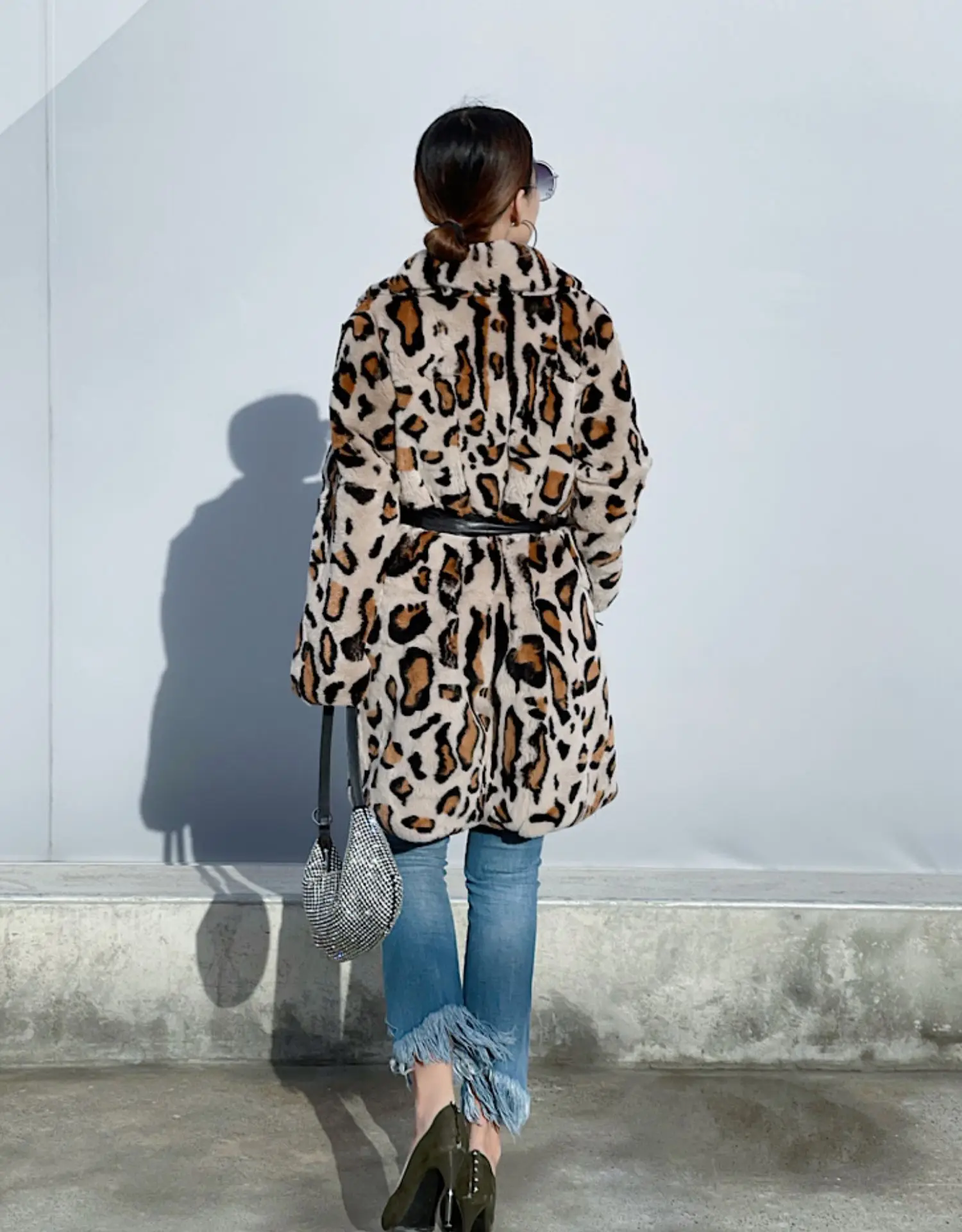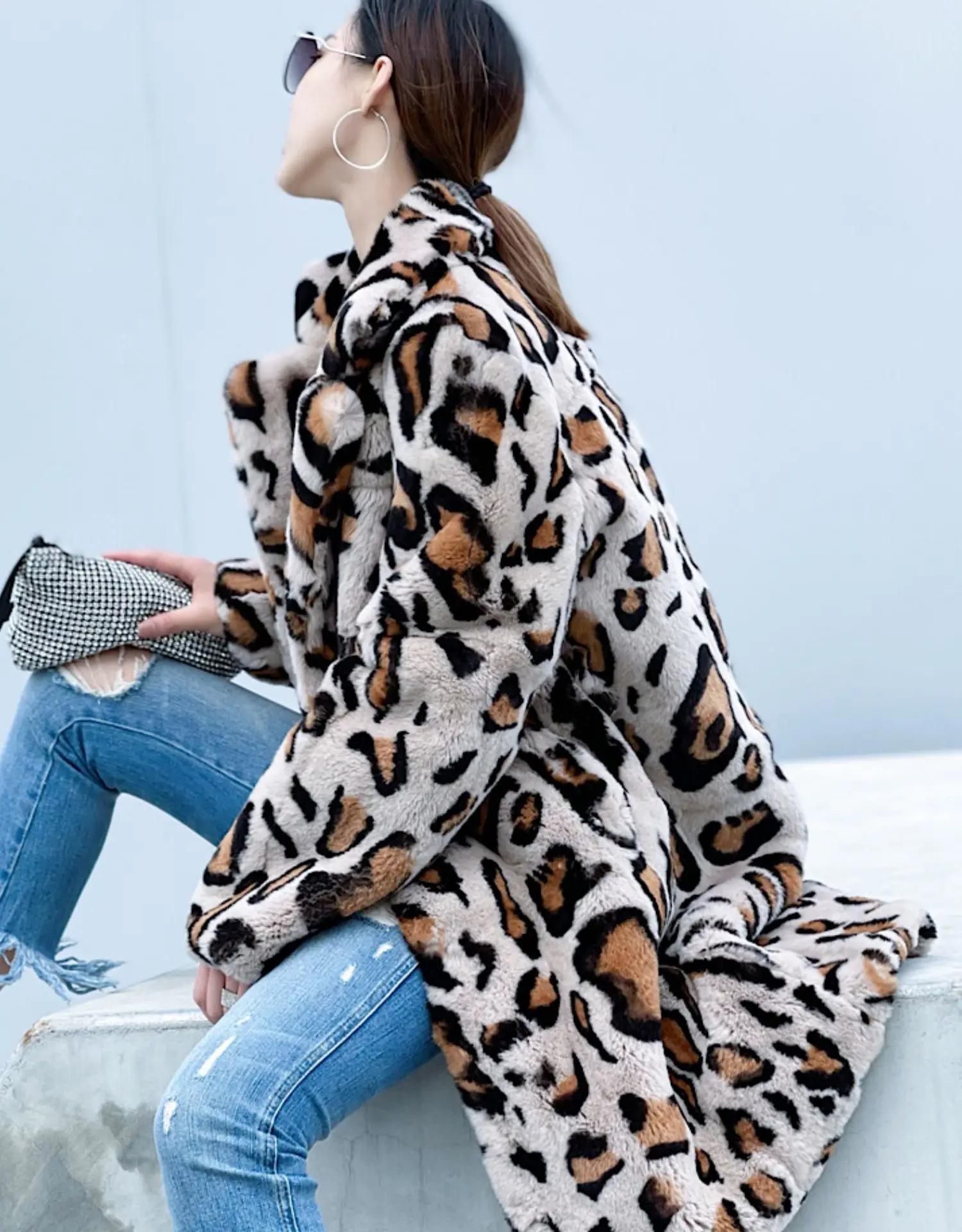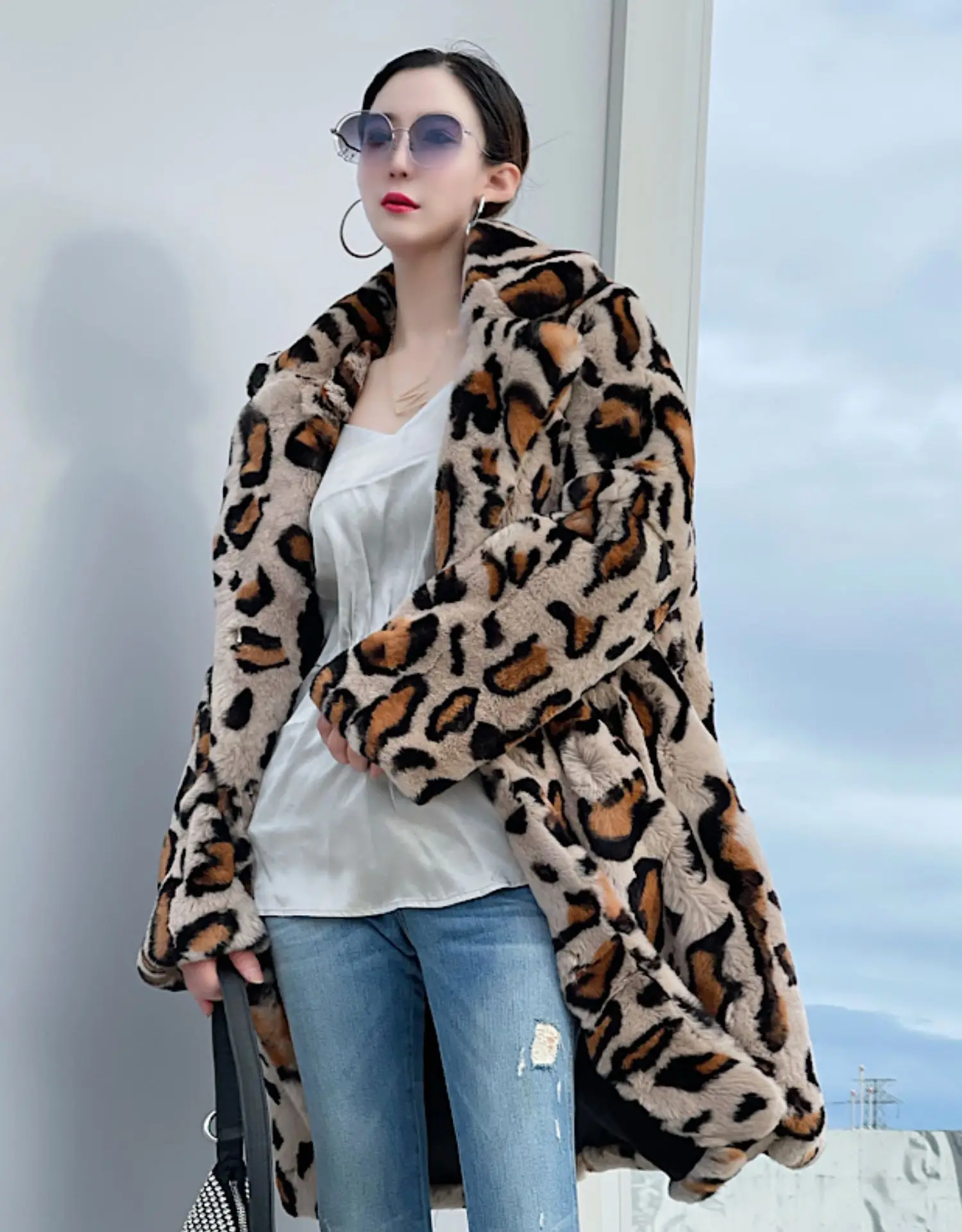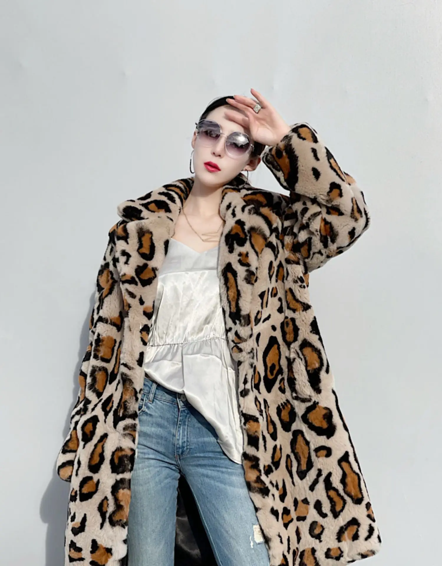 LAVELACHE 2023 New Luxury Leopard Pattern Long Winter Coat Women 100% Natural Rabbit Fur Jacket Casual Overcoat with Belt