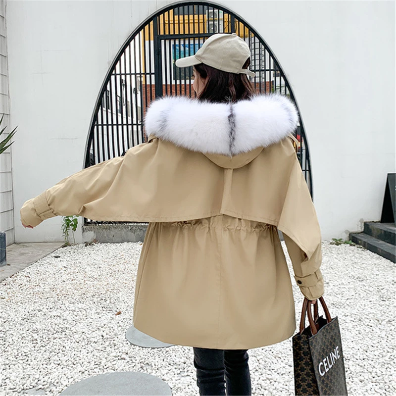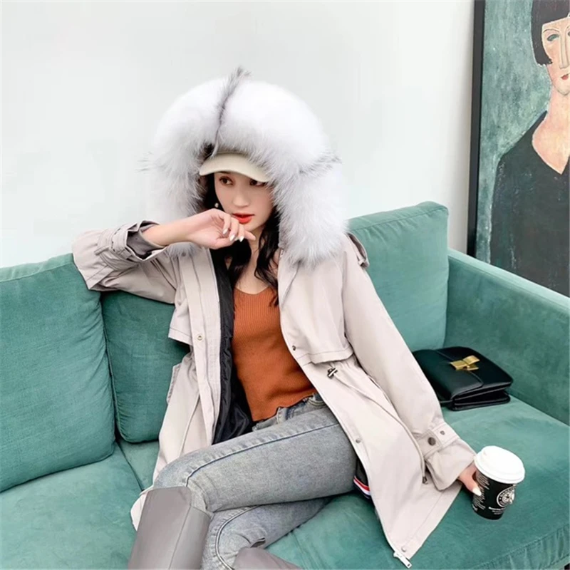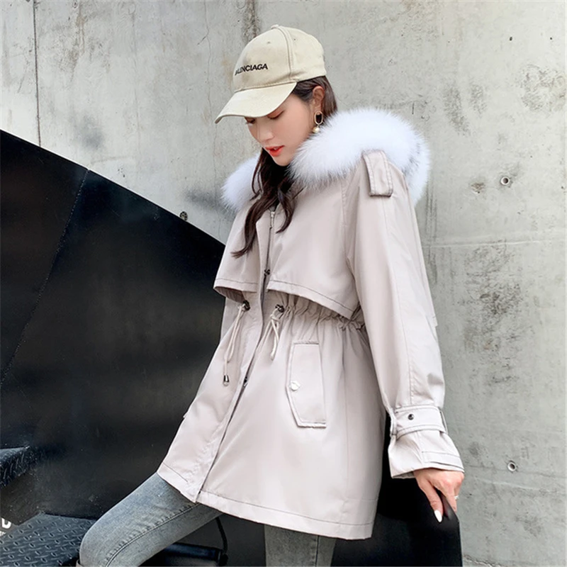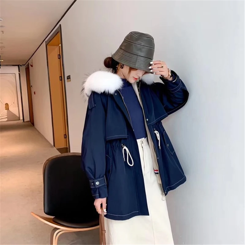 The Original Color Fox Fur Collar Parkas Female Winter New Rabbit Fur Lining Navy Blue Parkas Korean Waisted Hooded Jacket