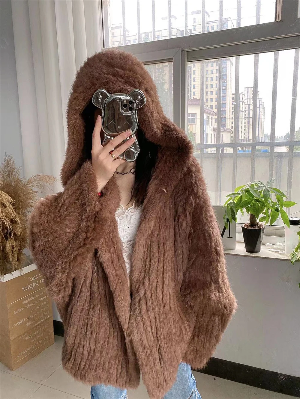 2023 Hot SaleAutumn Winter Rabbit Fur Knitted Genuine Real Fur Coat Women Fashion 70cm Lenght Fur Jacket Fashion Outerwear 70cm