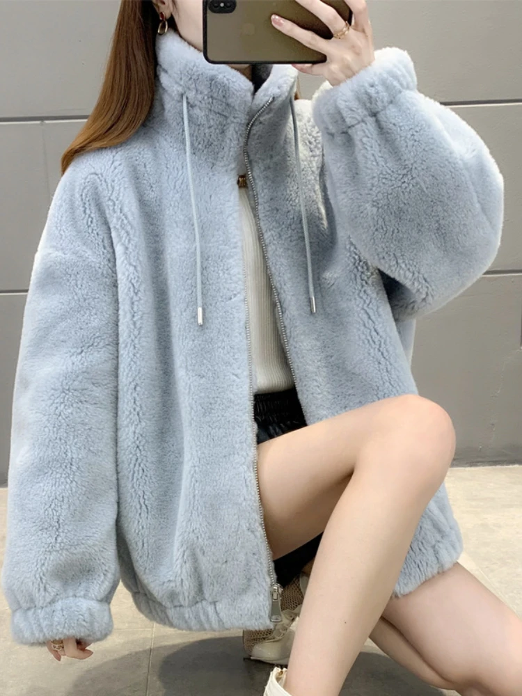 Fashion Wool Grain Fleece Content Fabric Winter Jacket Real Fur Women Coat Thick Loose Hooded Warm Loose Streetwear