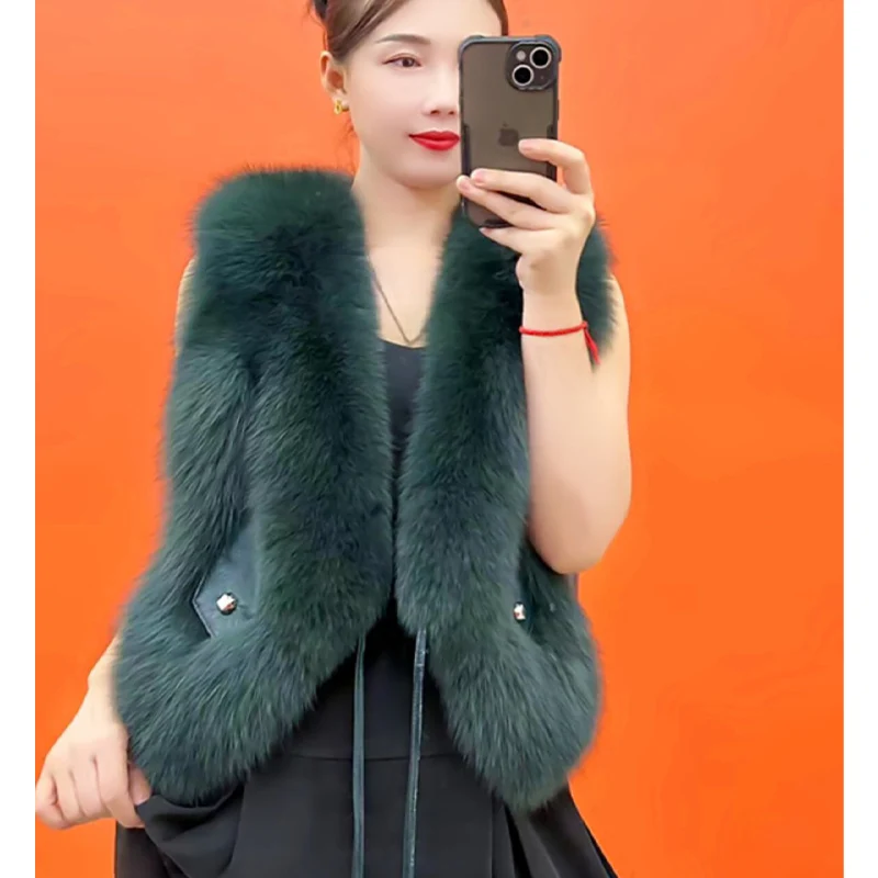 2023 New Autumn Winter Women's Vest Real Natural Fox Fur Coat Thick Warm Mid Length Waistcoat Luxury Female Jacket outerwear