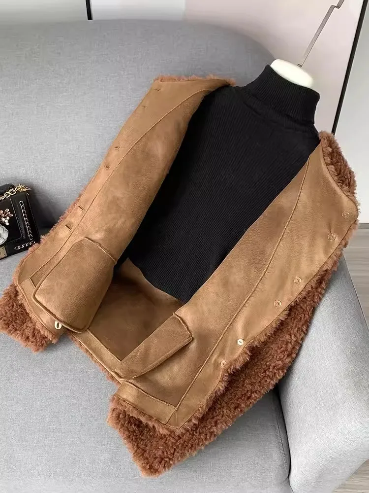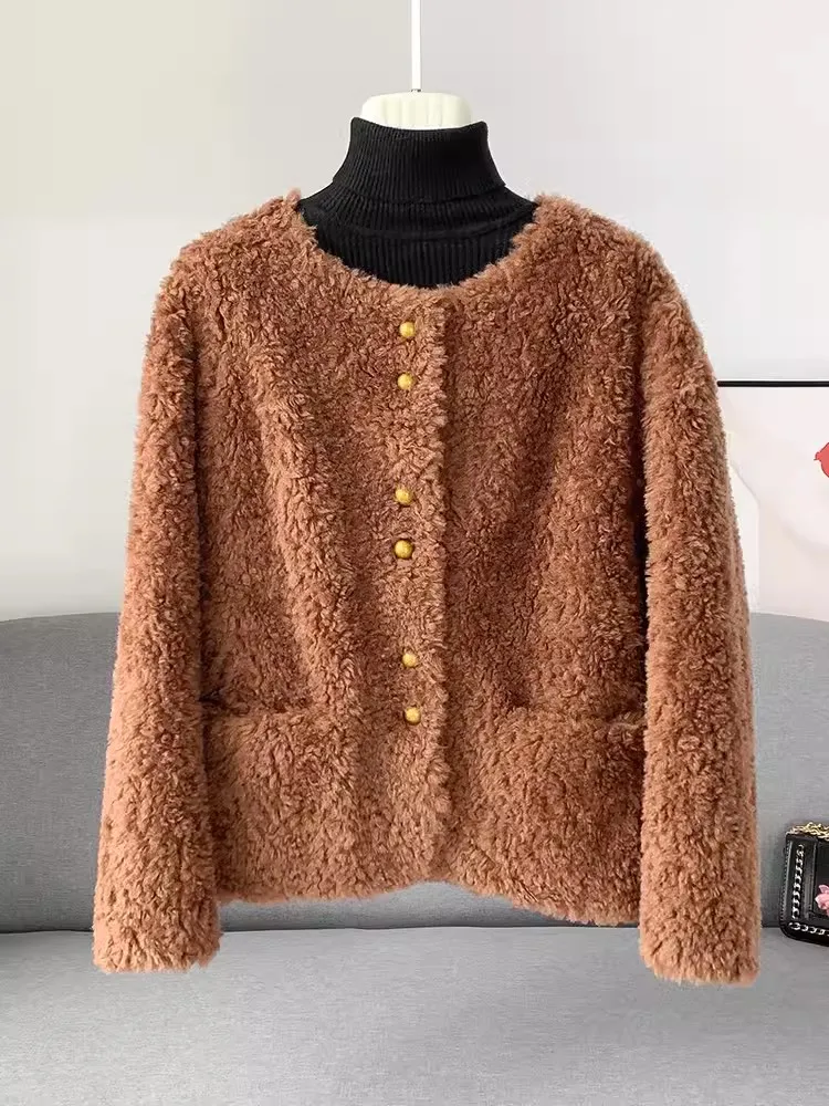 Women Autumn Winter Real Wool Jacket O Neck Single Breasted Natural Sheep Fur Coat Vintage Office Ladies Thick Warm Overcoat