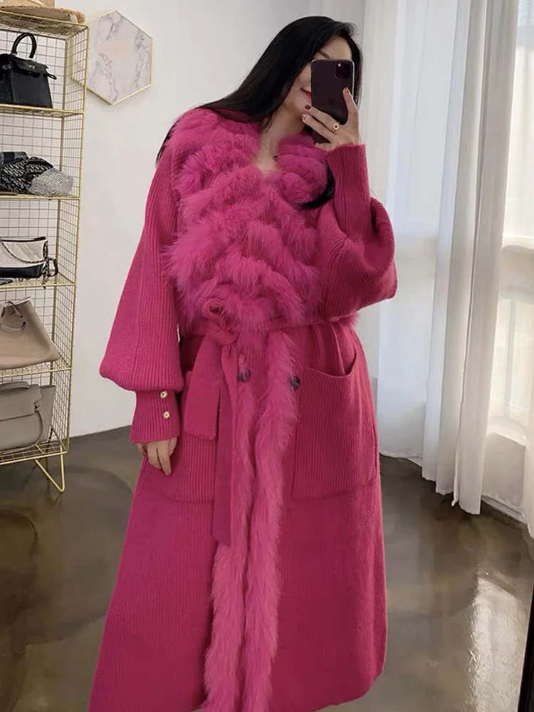 Women Special Autumn Real Fox Fur Knitting OverSize Coat Fox Fur Collar Lady's Fashion Spring Long Sweater Length 110cm