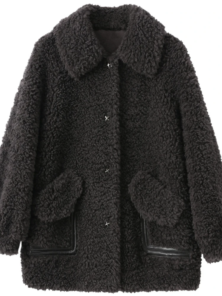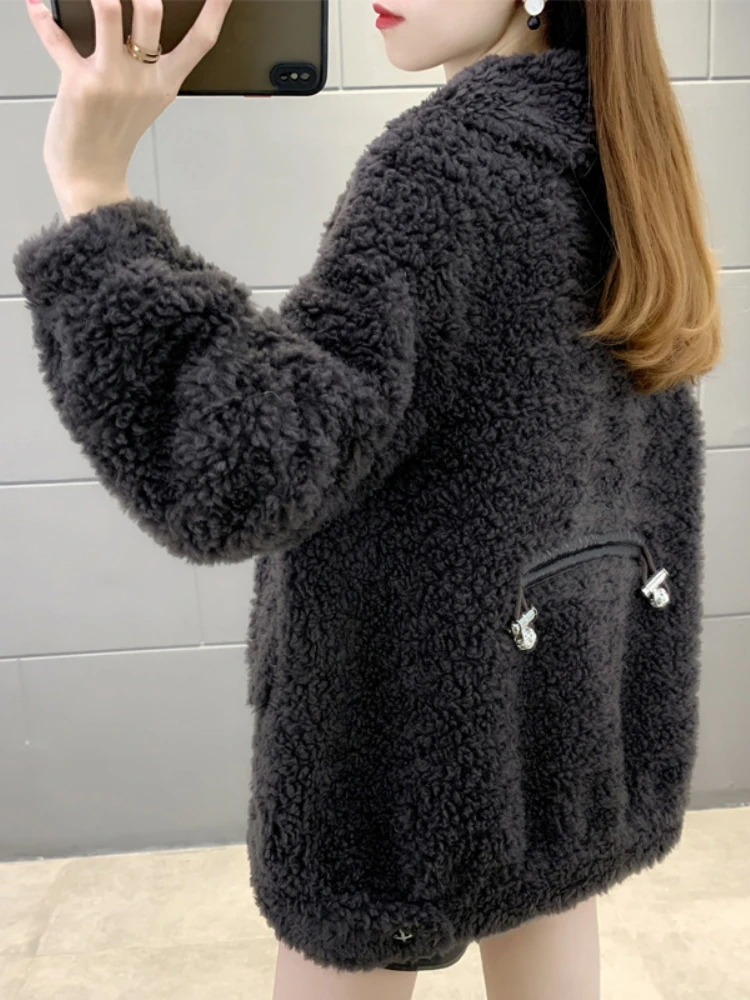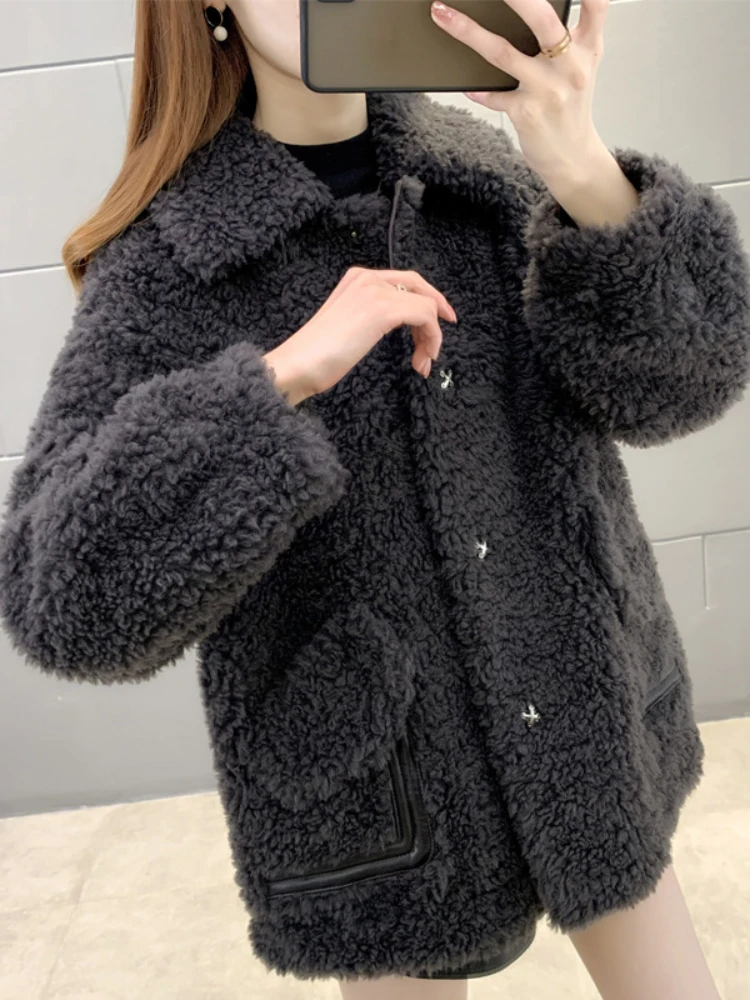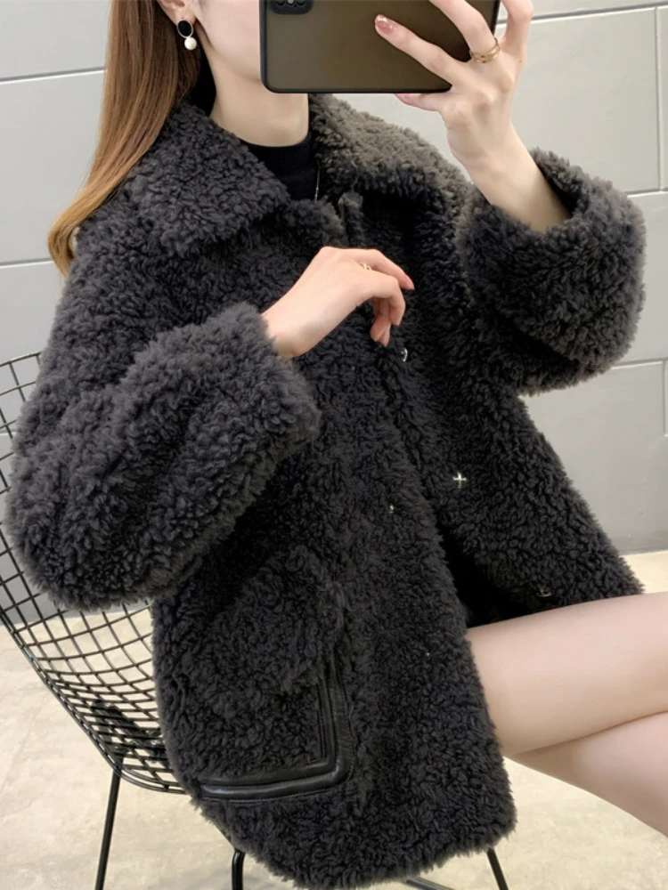 2023 Real Fur Coat Casual Winter Jacket Women Natural Knitted Wool Turndown Collar Thick Warm Streetwear Fashion Outerwear