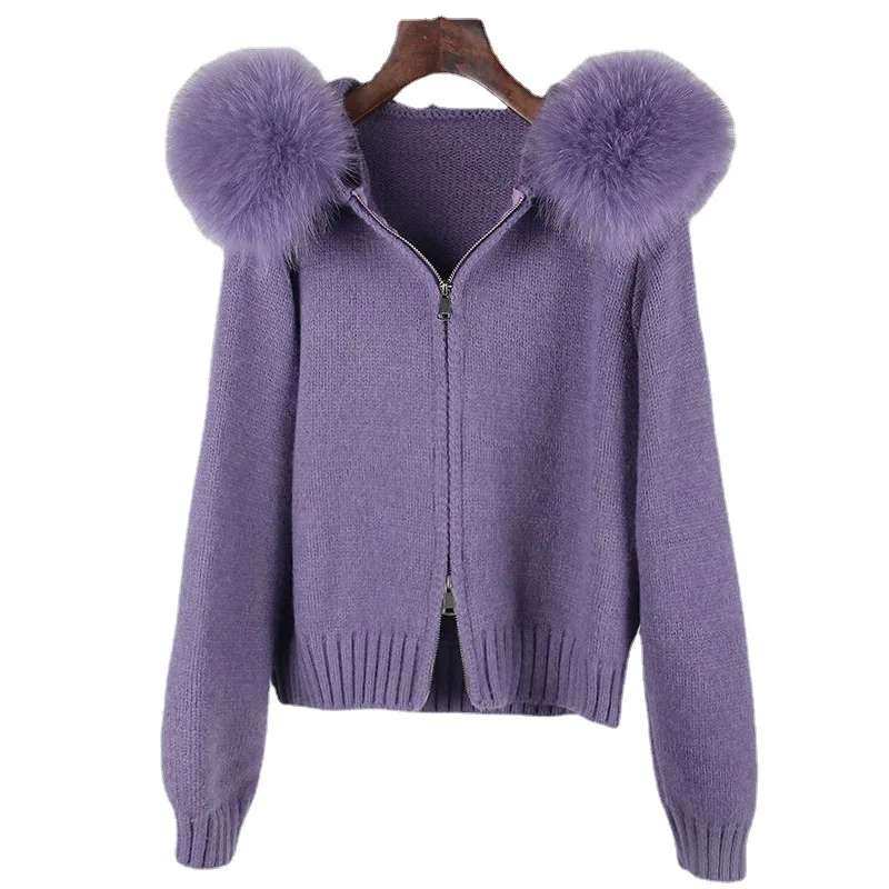New Autumn/Winter Casual Hooded Real Fox Fur Collar Fashion Versatile Knit Top with Fur Coat for Women 2024