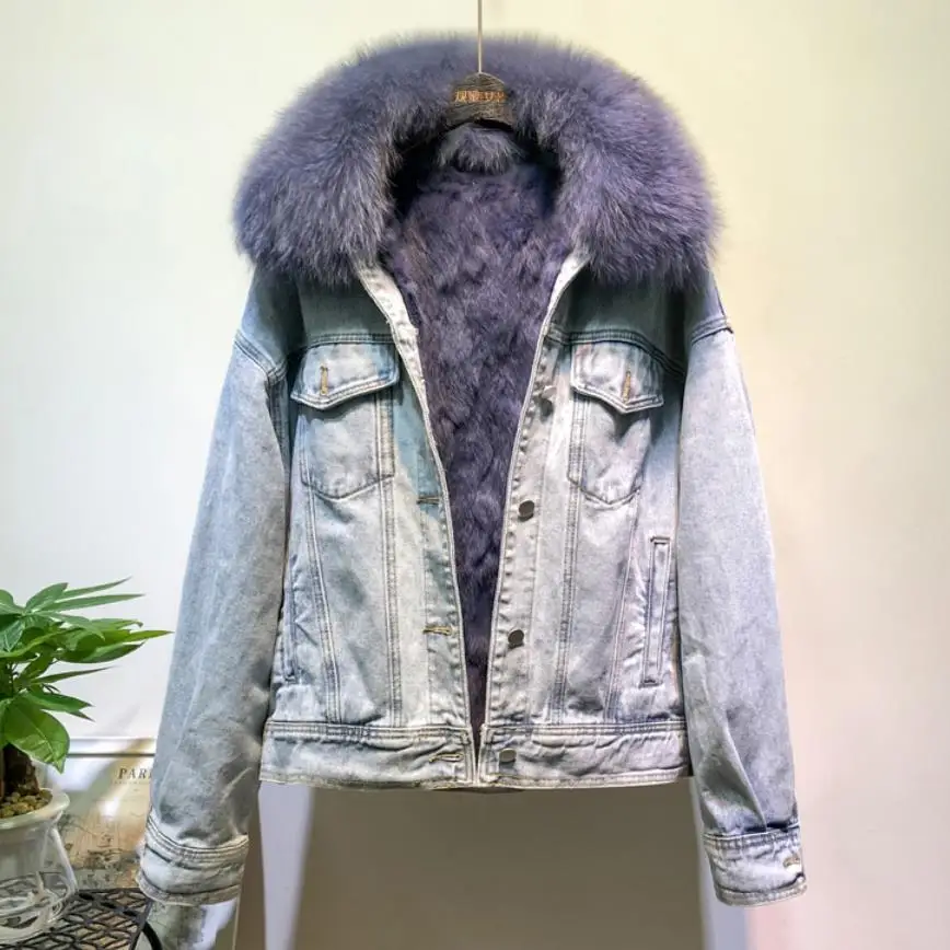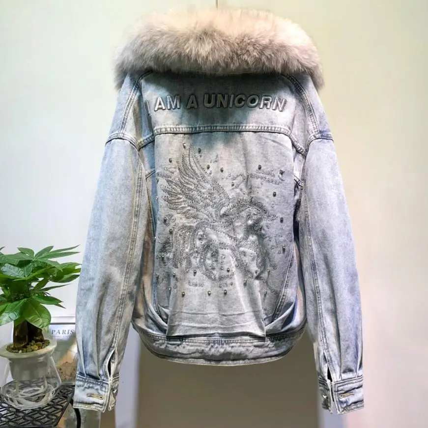 Real Fox fur collar thicker warm denim jacket female winter real rabbit fur liner detachable diamond beading real fur coat F2064