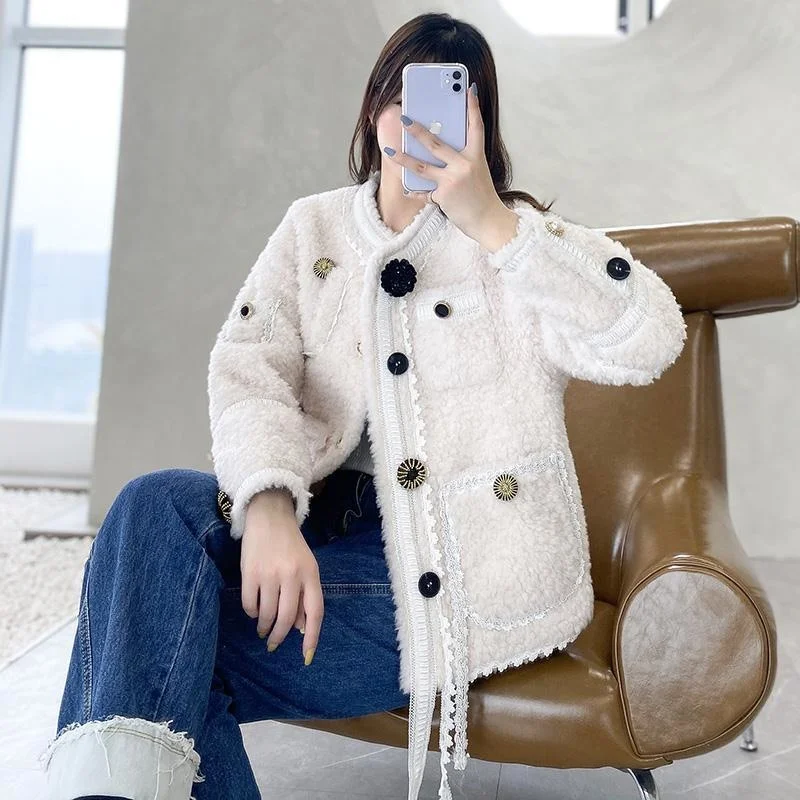 Autumn 2023 Women Winter Fashion Short Sheep Shearing Coats Female Genuine Wool Fur Jackets Ladies O-neck Loose Overcoats Q02