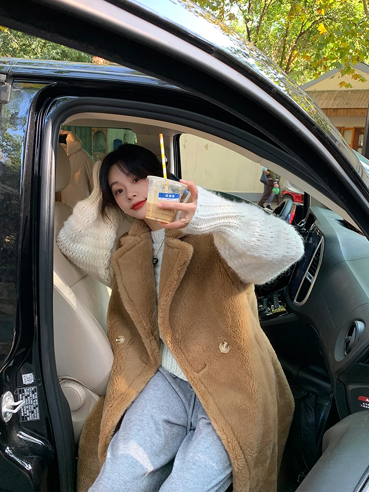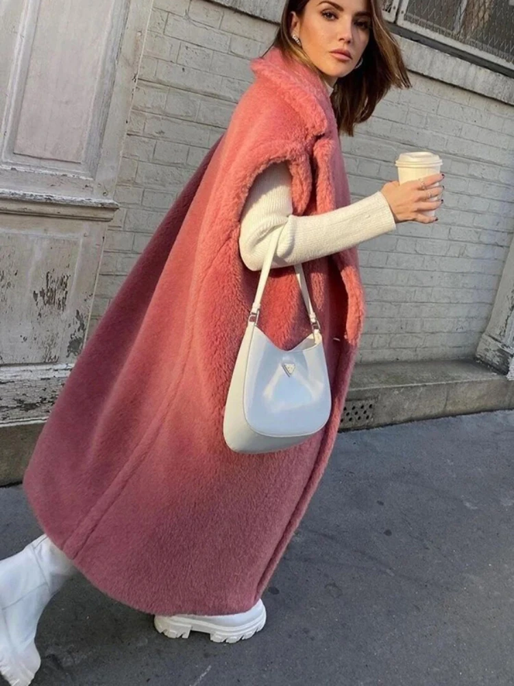 MENINA BONITA Real Fur Long Coat Winter Jacket Women 100% Wool Woven Fabric Warm Vest Loose Outerwear Oversize Streetwear Teddy