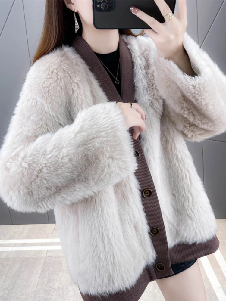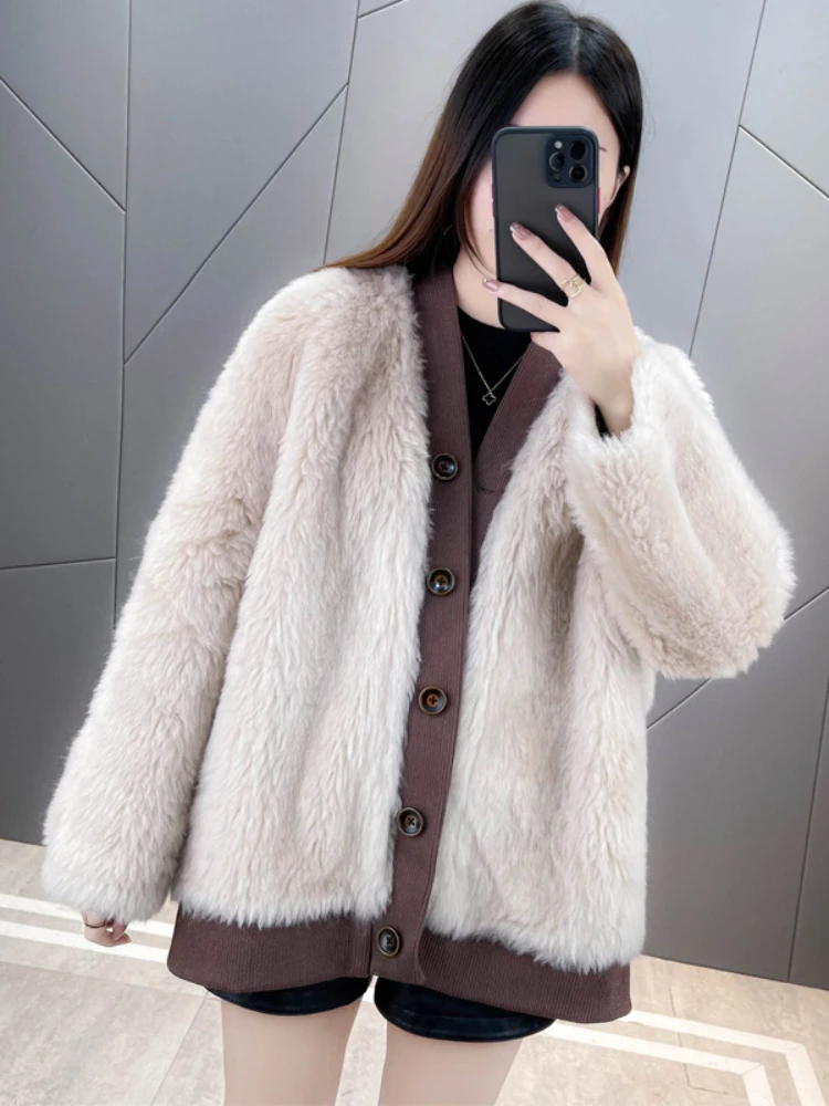2023 Real Fur Coat Casual Winter Jacket Women Natural Knitted Wool Fur Single-breasted Warm Streetwear Fashion Outerwear