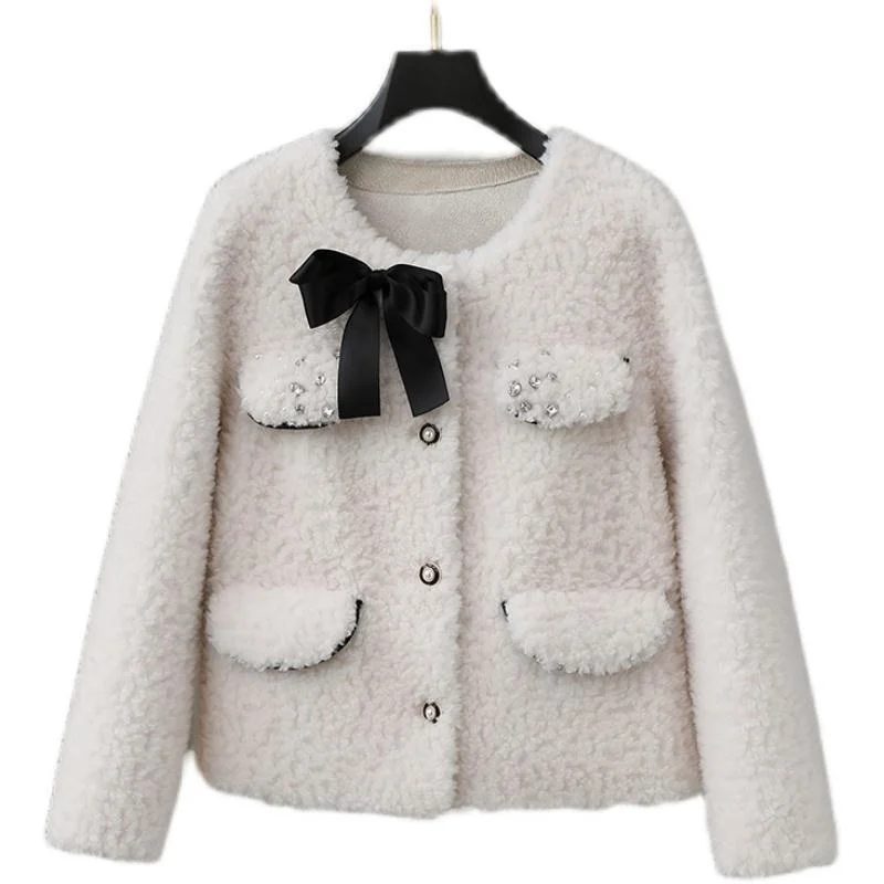 Women's Autumn 2023 Winter Fashion O-neck Bow Outerwear Female Genuine Lamb Fur Coats Ladies Sheep Shearing Warm Jackets Q25